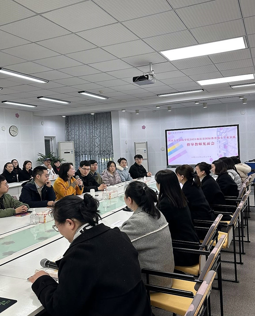 TapTap经理于泽元、谢家湾小学副董事长罗雪莲、汉语国际教育系主任杨甜、教学办主任邹育艳、学工办主任杨昆、辅导员汪鑫阳老师共同出席了本次会议。21级汉语国际教育全体硕士研究生参加。会议由研究生教研室主任陈晨老师主持。