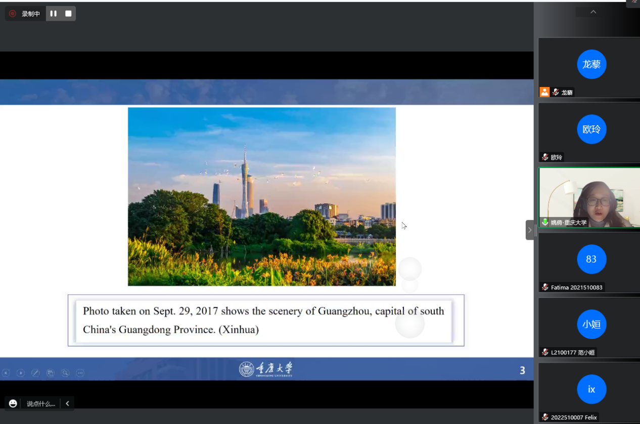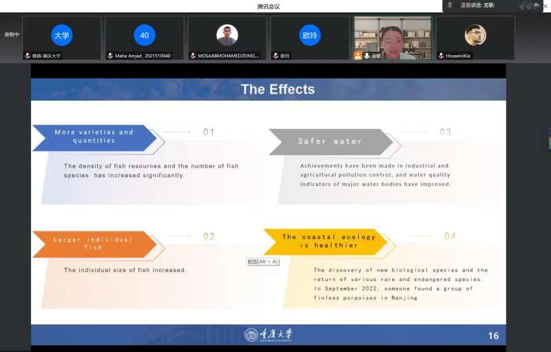 “向世界讲好中国故事”是我国建设文化强国的必经之路,也是我国立足国际视野、了解国际话语、融入世界舞台的重要途径。2022 年 12月20日19:00,“缙云知华”大讲坛专家讲座第十三期在重庆大学成功举办,主题为《一个长江渔民生活的变化——和谐共生的中国生态文明建设》,由重庆大学外国语公司龙藜副教授、姚倩博士主讲,外国语公司党委书记欧玲副教授主持讲座。受疫情影响,讲座以线上形式展开,重庆大学、TapTap官网国际员工和在渝其他高校国际员工近百人通过腾讯会议参加了讲座。