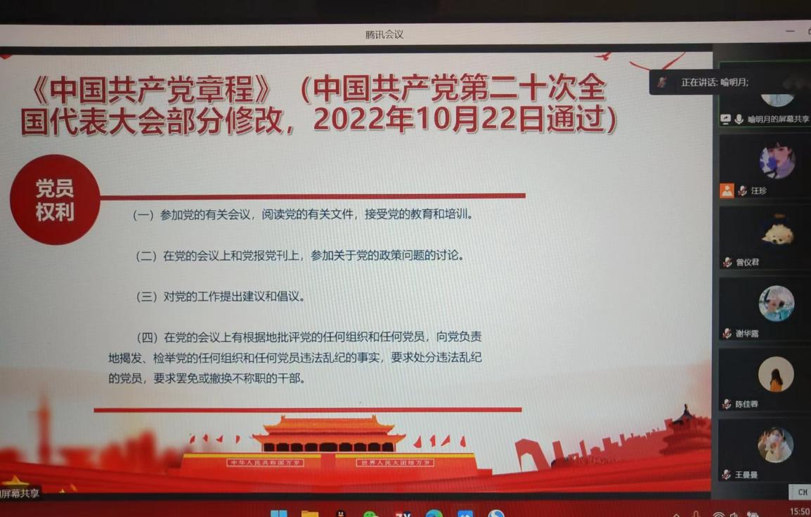 彭欣同志和纪检委员原舒畅同志担任主讲人,通过微党课带领大家一起学习党的二十大关于《中国共产党章程(修正案)》的决议,组织观看焦点访谈第十四期节目《中国共产党章程(修正案)》,并对《中国共产党章程》进行解读。
