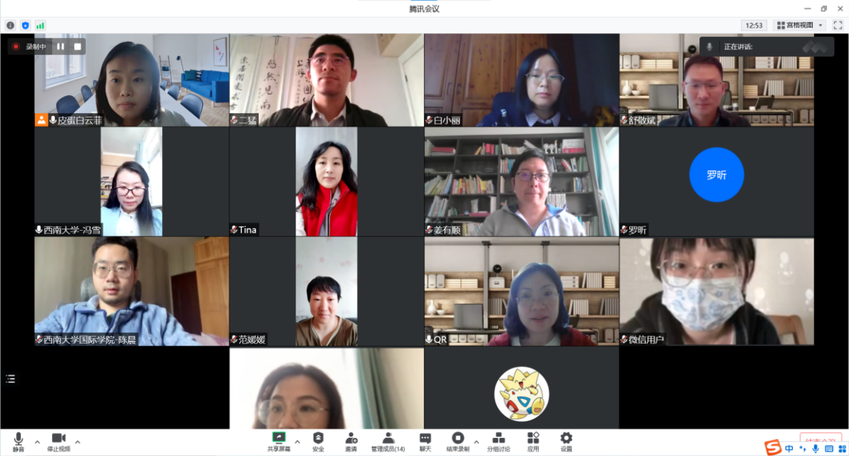 在交流分享环节,王湛明讲述留守校内期间,为了保障职工日常生活,为员工代领餐券、组织核酸检测、处理签证问题、发放生活费等累并快乐着的工作经历。黄无为分享志愿服务期间被通知成为“密接”后的心路历程。杨锐分享居家办公期间每天统计全院教职员工的核酸检测结果、更新公司网站等工作内容。杨昆回忆自己再次入住紫云楼与职工同吃同住的经历。王鹊建议公司统筹全校来华留学工作、突破瓶颈、攻坚克难,继续打造“留学西大”品牌。李航副经理赞扬大家在校内外坚持工作所做出的努力。随后,支部为11月过政治生日的陈雨曦同志送上祝福。