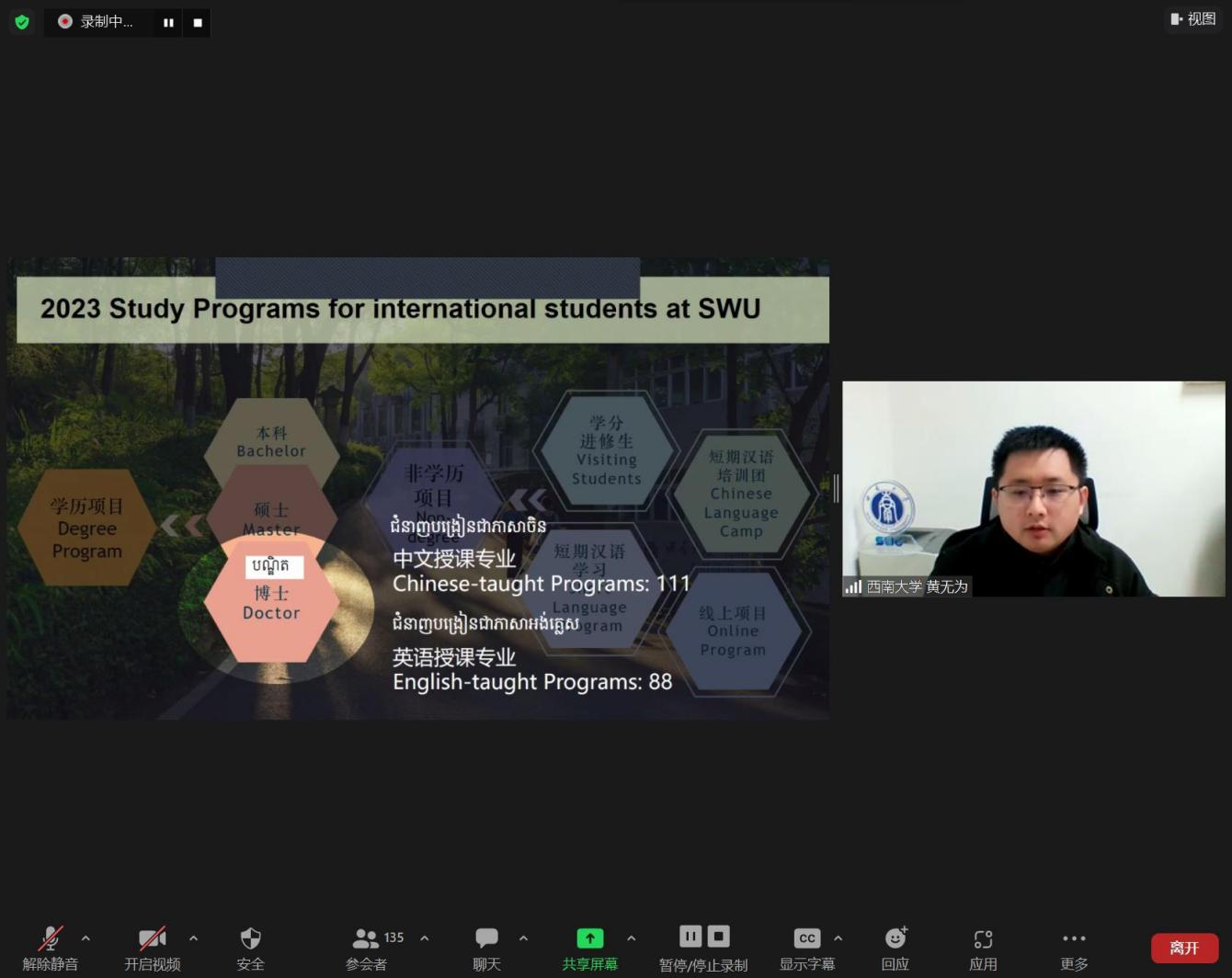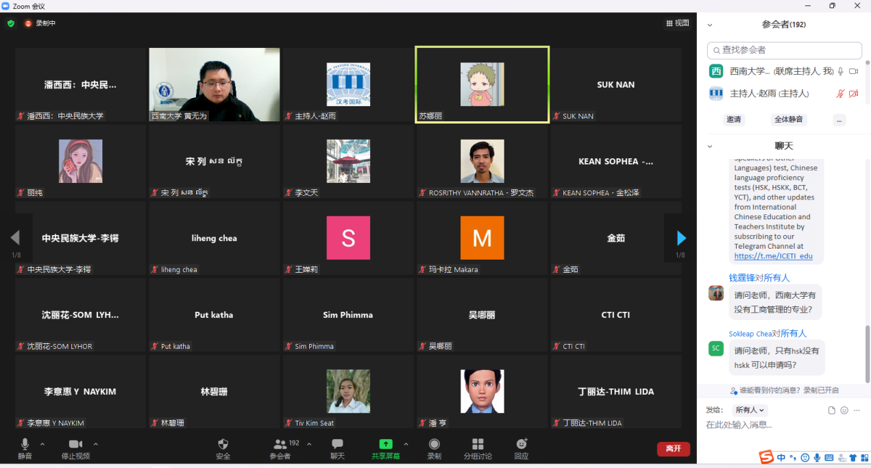 北京时间11月29日下午,HSK汉考国际柬埔寨线上教育展开展,公司受邀参加。为准确传递宣讲内容,增强宣讲感染力,确保宣讲效果,公司提前将所有宣讲材料翻译为中柬双语版本。招生办公室主任黄无为主讲,近190名柬埔寨员工参加宣讲会。