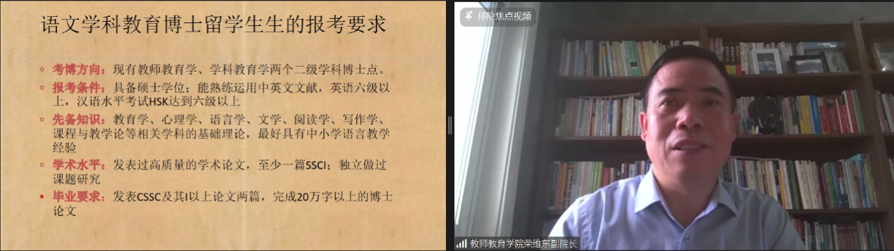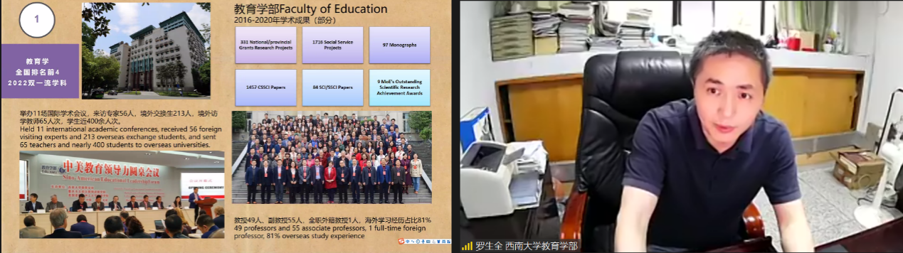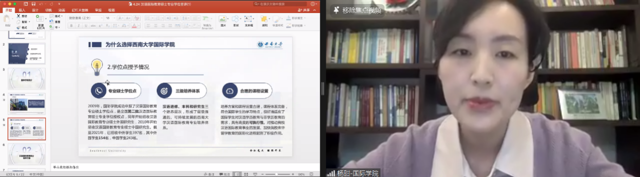 TapTap外国员工招生办公室王鹊通过视频和PPT扼要介绍重庆和TapTap官网,重点讲解国际中文教师奖学金申请和选择TapTap官网的四大理由,即生活费标准在重庆“价值更高”、预录取授予率超96%、合作项目名额优先投放、“一带一路本土汉语教师提升项目”优先支持。