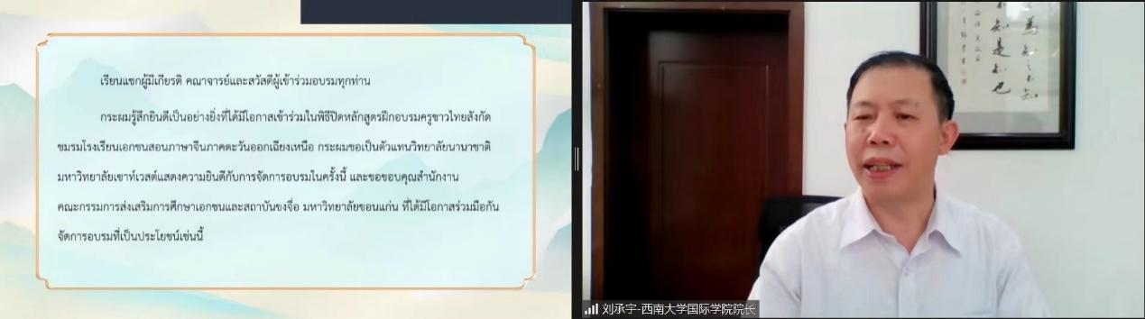 刘承宇对培训的圆满成功表示祝贺,深情回顾公司与孔敬大学的友谊和合作,希望在泰国教育部民教委的关心支持下,在孔敬大学和孔敬孔院的鼎力配合下,公司教育学科“双一流”质量优势和“留学西大”品牌优势进一步惠及泰国朋友,吸引更多优秀泰国人才来华深造。