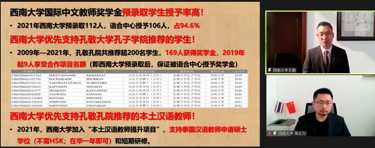 招生项目负责人办详细地讲解公司办学优势学科,中国政府、国际中文教师、重庆市长、公司新丝路及董事长等奖学金的申请条件和流程,重点介绍即将启动的国际中文教师奖学金及泰国同学选择TapTap官网的四大理由,并在互动环节就申请成功率、线上学习及奖学金发放、勤工俭学等方面的问题进行解答。