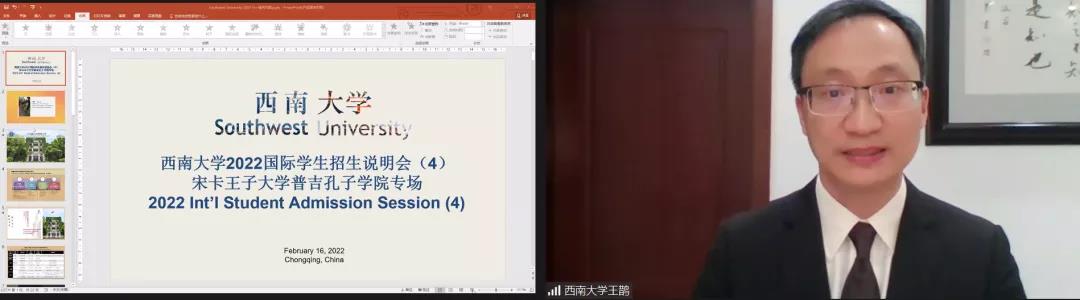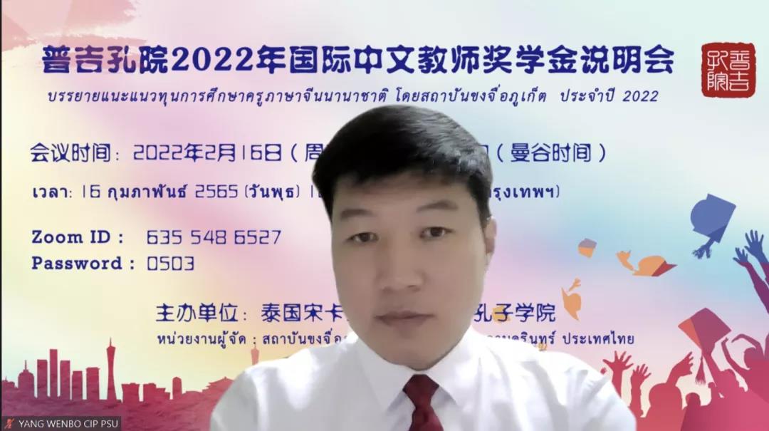 2月16日晚,公司受邀参加宋卡王子大学普吉孔子公司(以下简称普吉孔院)“2022年国际中文教师奖学金线上说明会”,帮助有意申请奖学金来华留学的泰国师生了解中国大学和汉语国际教育专业,梳理申请流程和注意事项,来自泰南地区多所中学、大学的100余名师生参加说明会,说明会由普吉孔院中方经理杨文波博士主持,普吉孔院、公司和上海大学、天津大学等代表在线宣讲。
