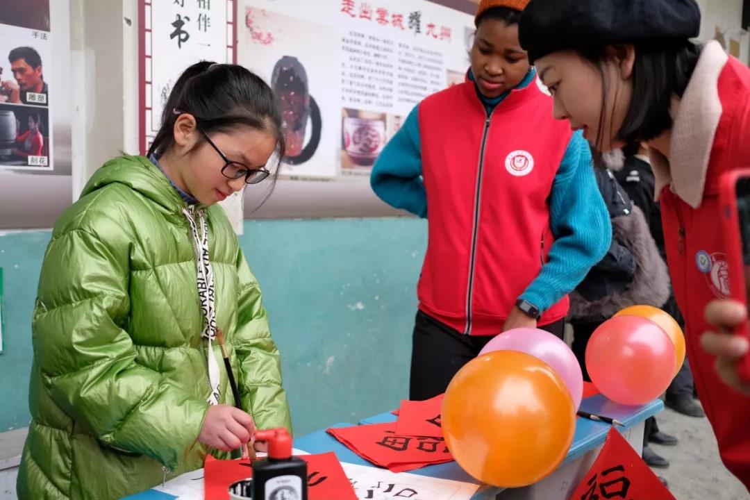 书法学习摊位上的孩子不多,偶尔来一两个孩子,都能拥有安安静静的时光,她们的笑意来源于不与周围争吵的时光。志愿者主要带着大家写福字,每一横每一勾,都细细讲述着中国文化传承的故事。职工志愿者也在这个摊位上,当稚嫩的手颤颤巍巍时,来自异国他乡的扶持牵引着它,探索世界共融的奥秘。