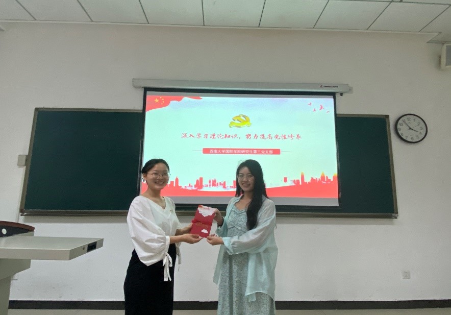 最后,党员景柯沥、陈姝君和王金燕三位同志过政治生日,支部为他们颁发了贺卡及礼物。三位同志表示,在今后的学习工作中,将继续以身边的优秀党员为榜样,严格按照党员标准要求自己,努力做一名无愧于党、无愧于时代、无愧于人民的好党员。