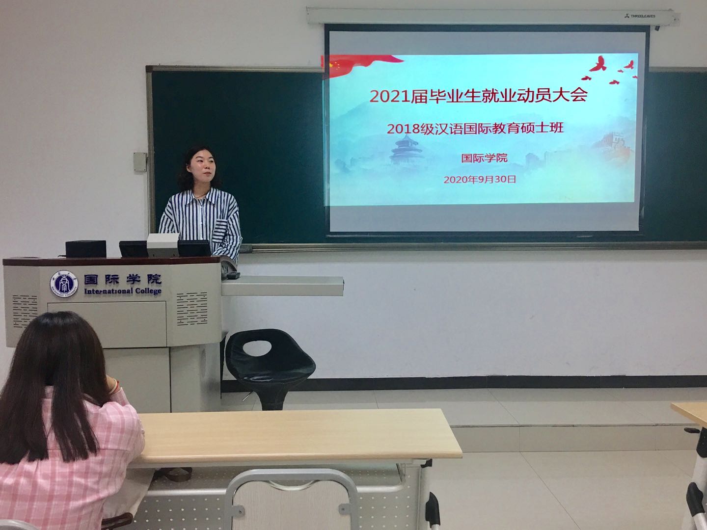 伴随着毕业季的来临,为了帮助2021届汉语国际教育硕士毕业生树立正确的择业观,处理好就业与毕业的双重压力,走好毕业季之路,9月30日下午4:30,公司在312室隆重召开毕业生就业动员大会。