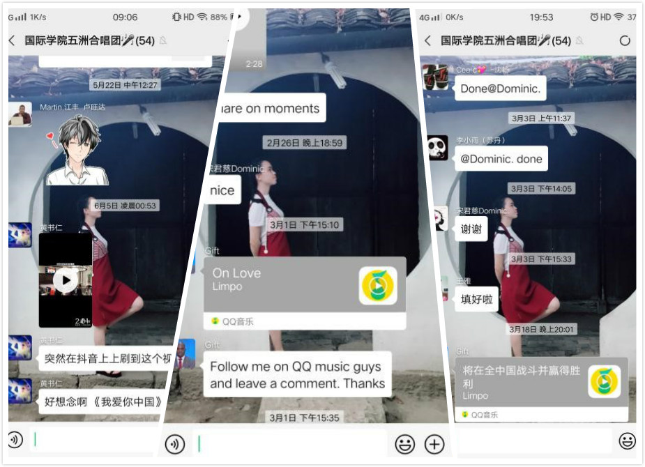 2020年2月8日是中国传统节日元宵节,作为五洲合唱团团长的我通过微信群给团员们加油打气:“今天是元宵佳节,在此祝大家元宵节快乐!希望大家做好疫情防护措施,待春暖花开之时,我们仍在美丽西大相聚!”。团员们因而深受感动并纷纷响应我的提议,在世界各地录制视频,共唱《我爱你中国》,为武汉祈福,为中国加油。