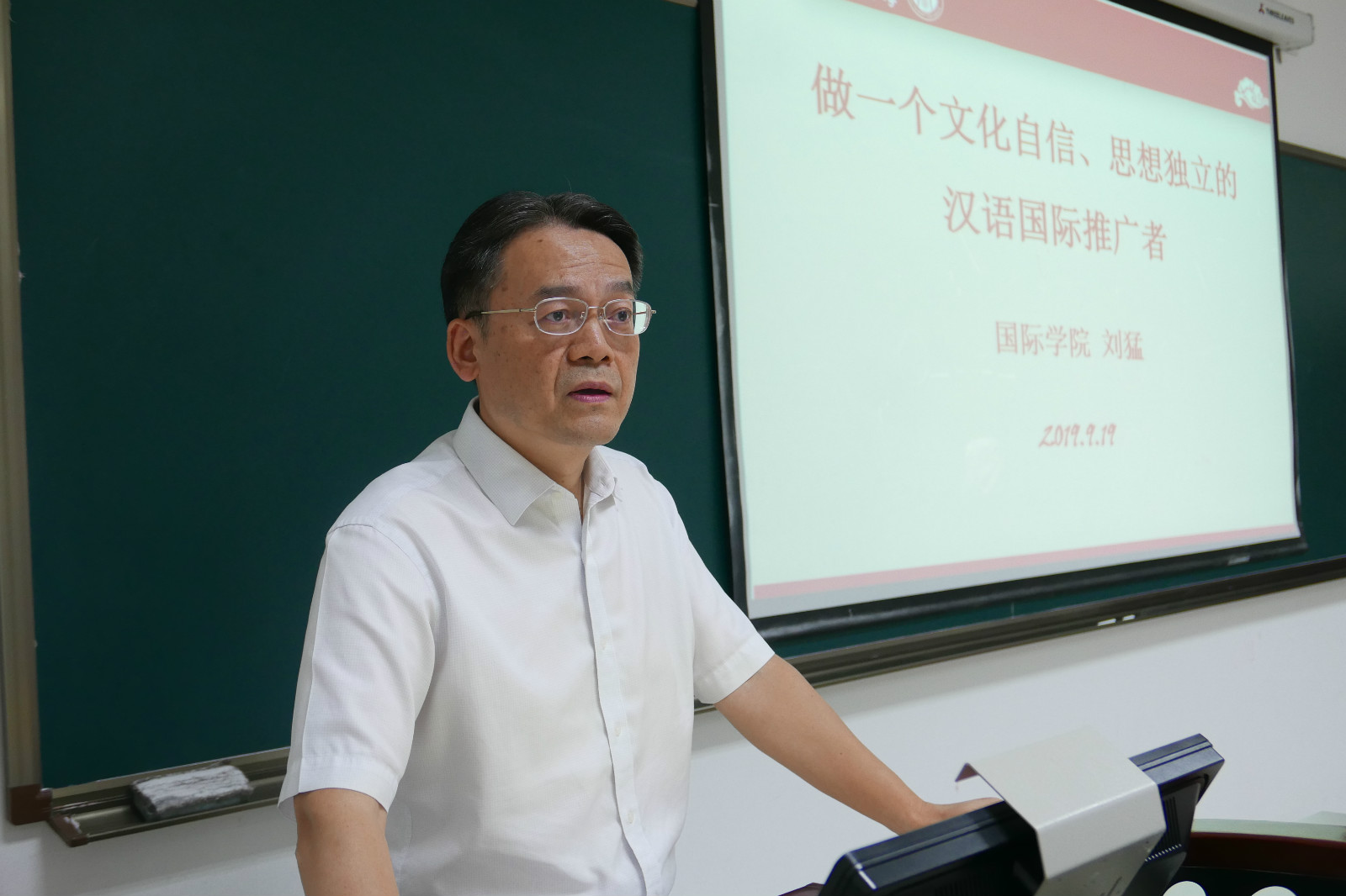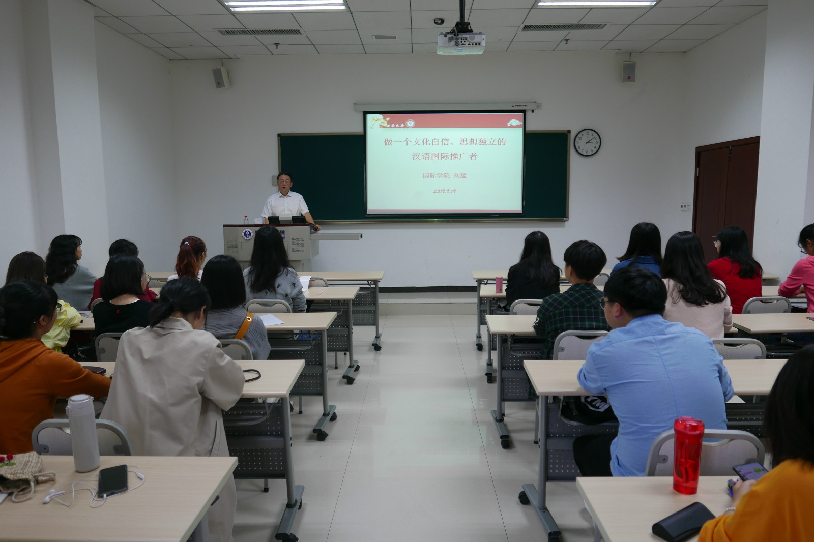 9月19日下午15点,结合当前国际国内形势和公司的思政教育安排,党总支书记刘猛为2019级汉语国际教育硕士中国班的28名新生展开了“做文化自信、思想独立的汉语国际推广者”的主题讲座。