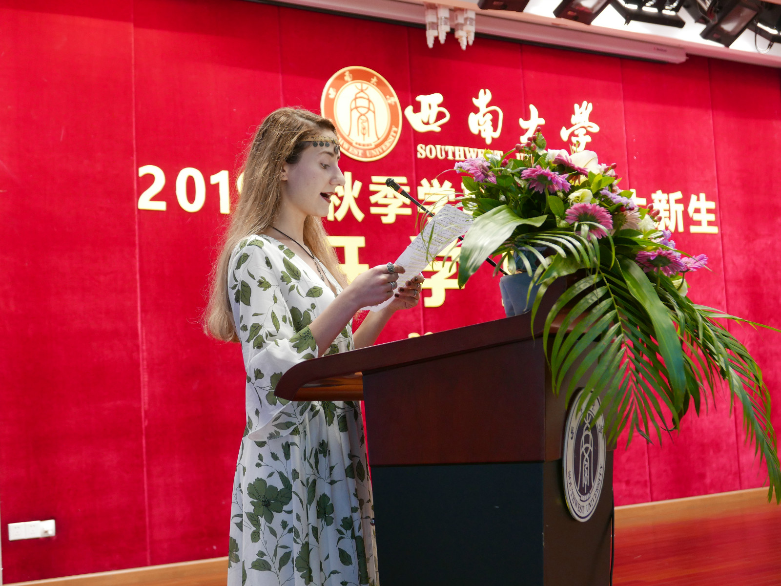 来自亚美尼亚的琵雅作为新生代表发言。她对中国政府和孔子公司提供的学习机会表示感谢,希望能尽快提高汉语水平,广泛交友,相互学习、相互交流、共同进步。