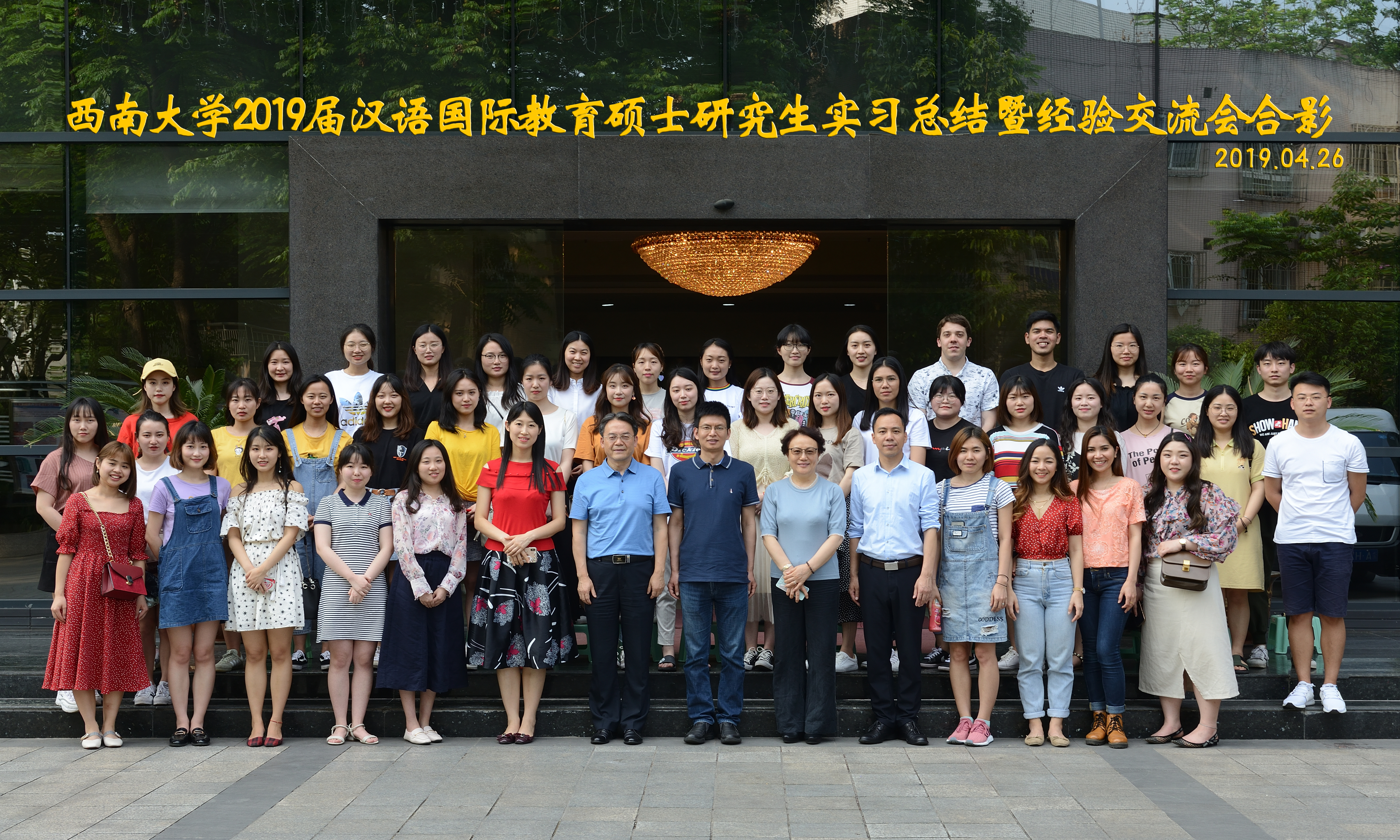 受表彰的优秀实习生和在场领导一起合影留念。最后,全体起立,齐唱校歌。实习总结汇报结束后,2017级与2018级汉语国际教育硕士进行了经验交流。至此,2019届汉语国际教育硕士研究生实习总结会暨经验交流会圆满结束。