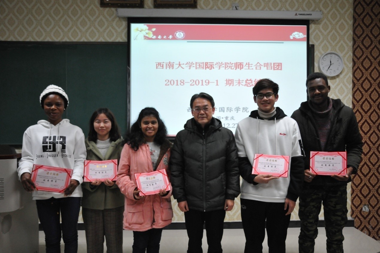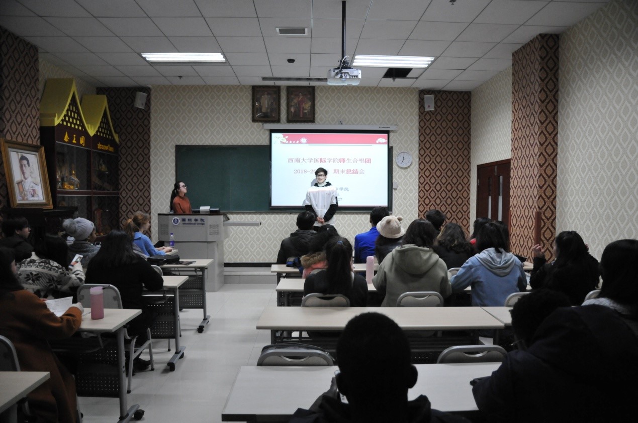 刘猛书记做总结发言。他首先对合唱团演出成功表示祝贺,然后提出了三点希望:一是坚持每周的排练,严格遵守纪律,服从指导老师的安排;二是积极主动学习中文歌曲,不仅可以提高汉语水平,还能在更大的舞台上展示自己;三是继续发扬合唱团的合唱精神,团结一致,精益求精,在排练和表演上有更高的追求。