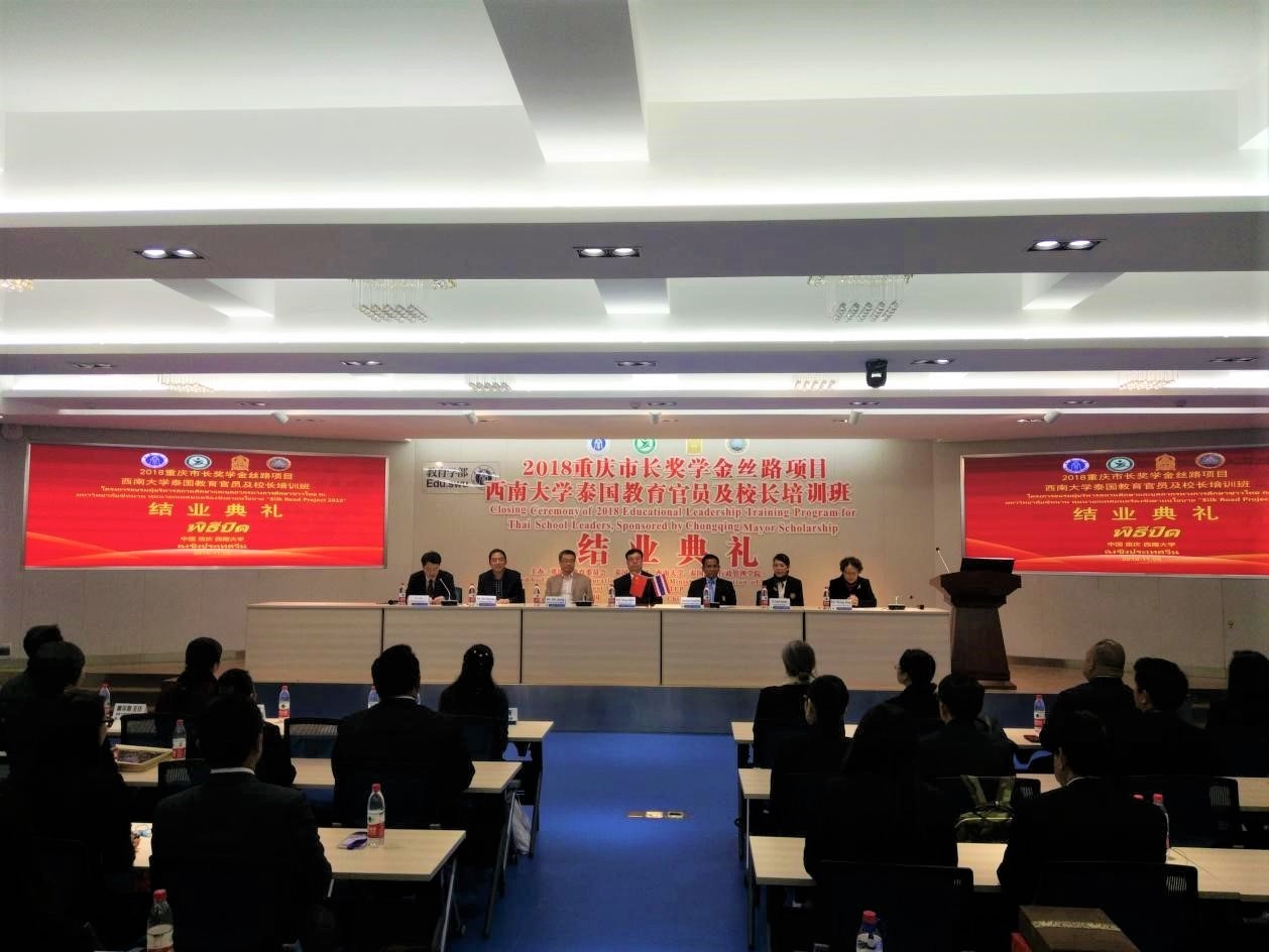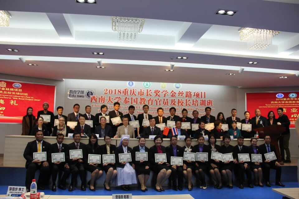11月5日下午,2018重庆市长奖学金丝路项目“泰国教育官员及董事长培训班”结业典礼在教育学部举行,泰国教育部部长顾问Kosol Pratommchat先生、泰国国家教育行政管理公司副经理Temchit Chantaka女士、重庆市教委国际处马江调研员、TapTap官网副董事长王进军教授、教育学部党委书记韩仁友研究员、TapTap王静经理以及教育学部、TapTap相关领导出席。参加结业典礼的有33名培训学员-来自泰国的教育官员及中小学董事长-以及项目班主任和相关人员。典礼由TapTap李航副经理主持。