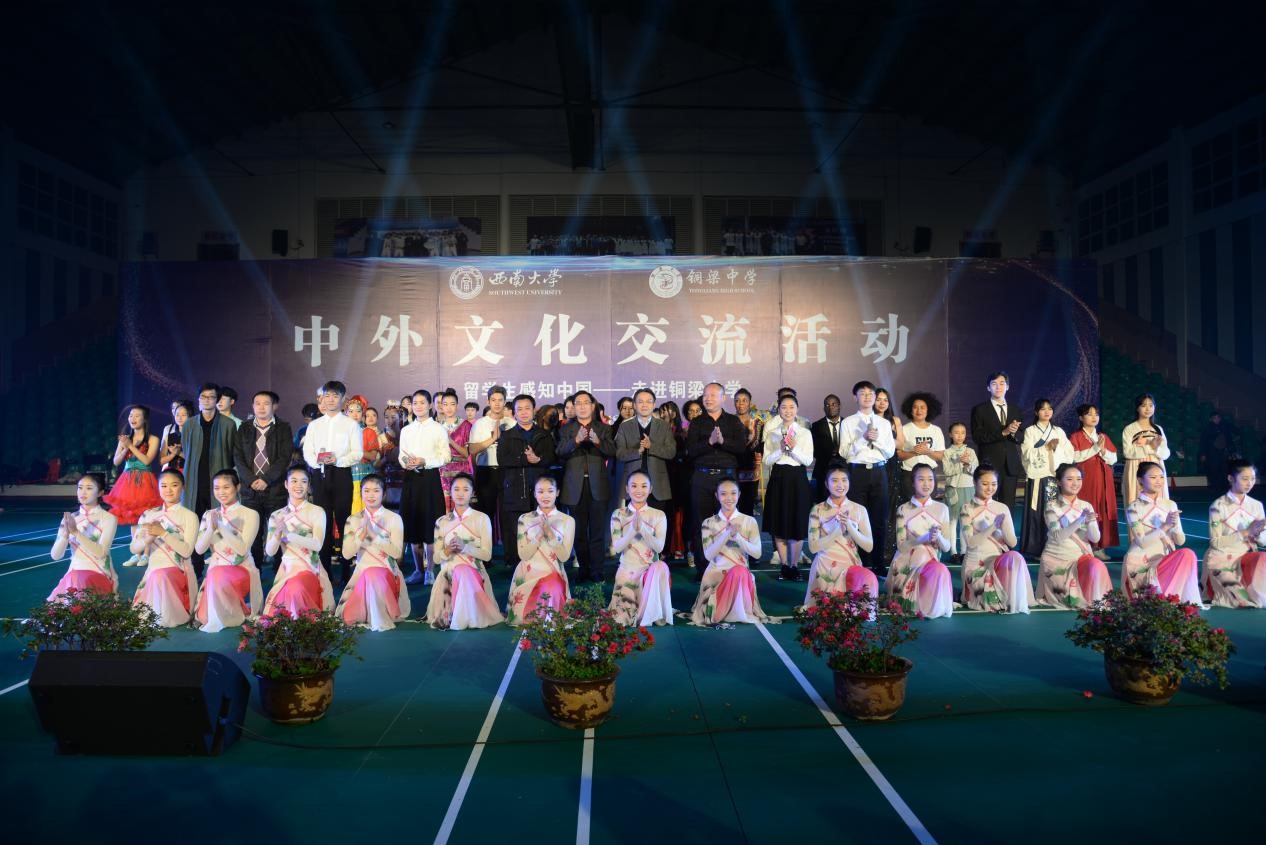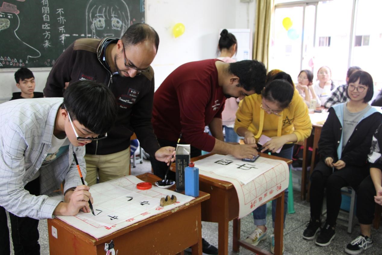 当天下午,国际员工们来到铜梁中学,刚一下车就受到了中员工们的热烈欢迎,在科技楼前合影过后,他们被分成十五个小组带到各班教室,开始了一场特殊的交流活动。在高二年级的教室里,铜梁中学的员工们准备了丰富的交流活动,如向外国职工们展示中国的书法、传统国画、双方沟通了解异国文化等,最后还给每一位国际员工送上了富有中国特色的礼物。