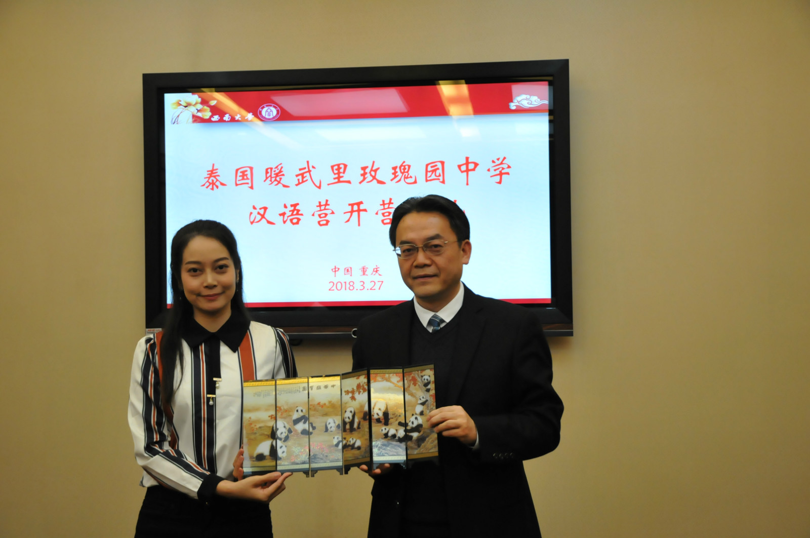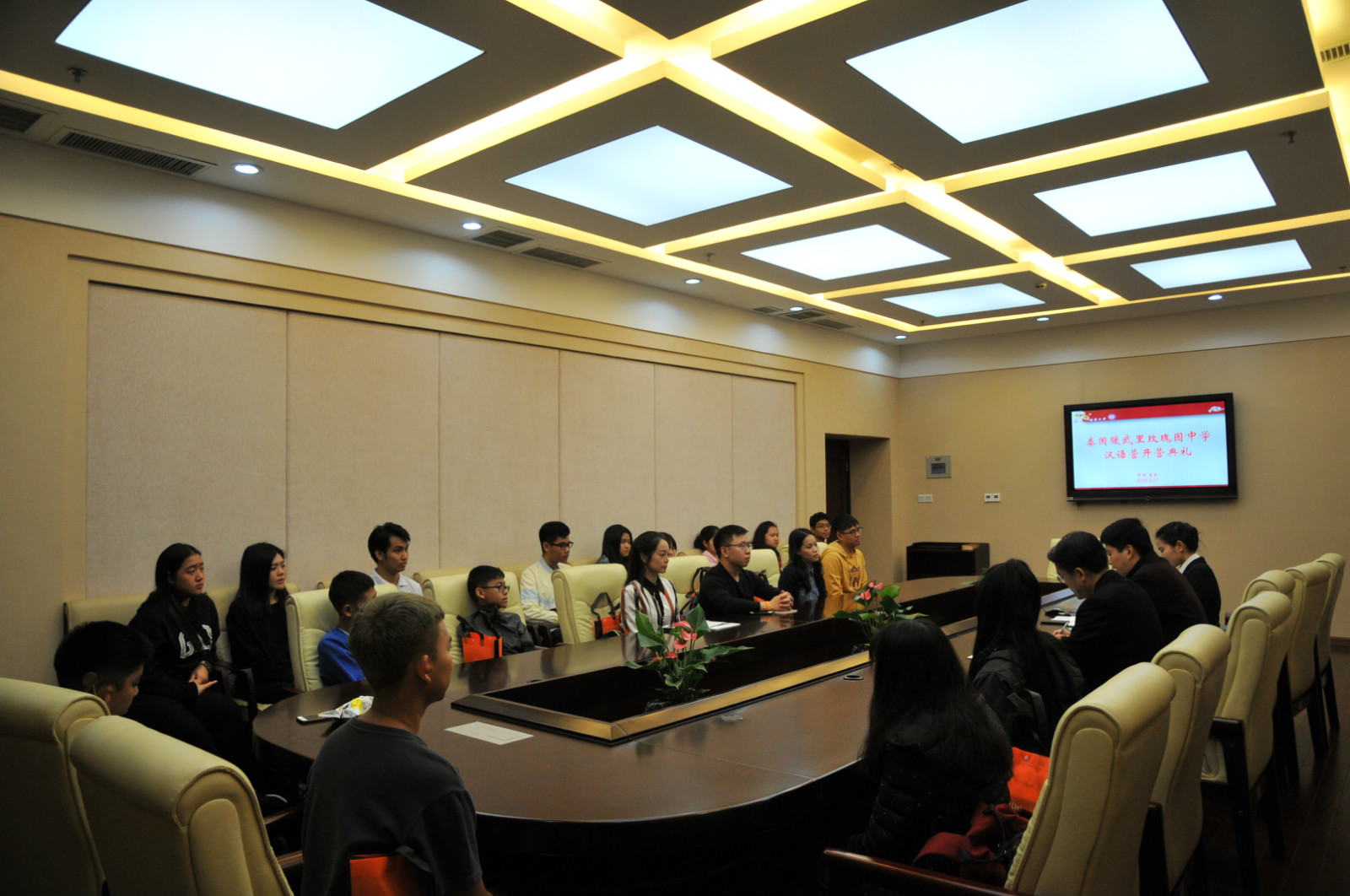 3月27日上午9点30分,泰国暖武里玫瑰园中学汉语营开营典礼在公司紫云楼签约室顺利举行,刘猛书记、学工办杨昆和泰国暖武里玫瑰园中学领队教师MISS.TAMAKORN SUKWATTANAPON,以及13名泰国中员工参加开营典礼。