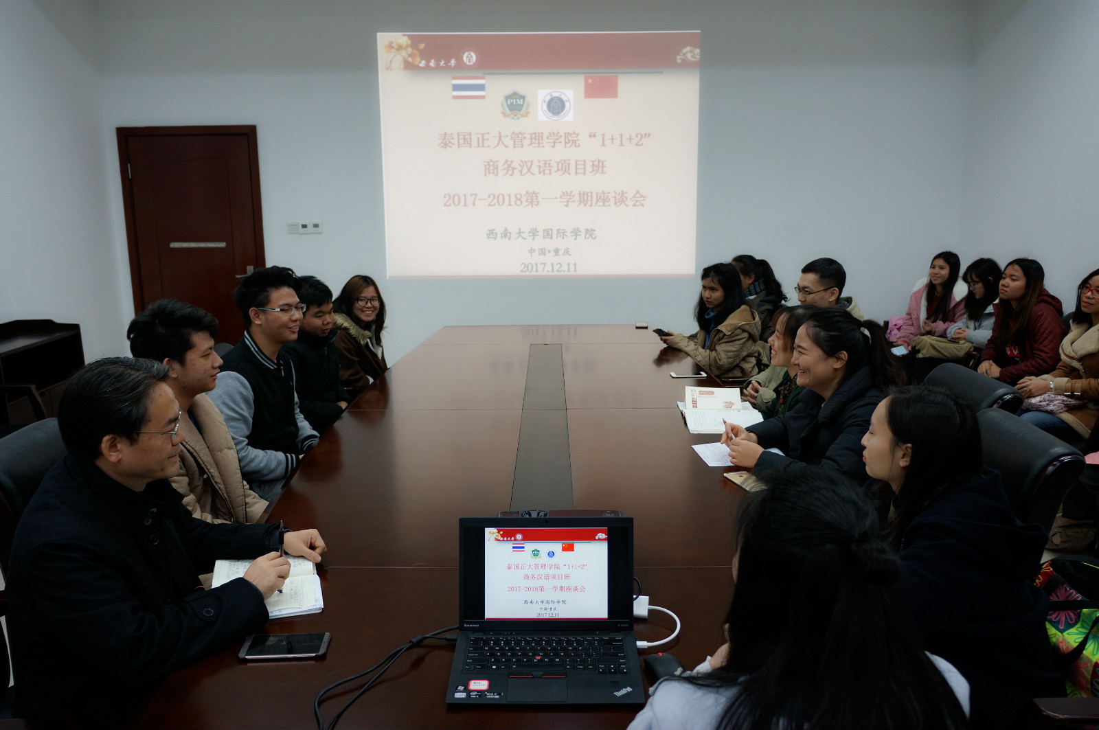 12月11日下午四点半,2017级泰国正大管理公司员工学期座谈会在TapTap304会议室圆满举行。公司党总支书记刘猛,正大管理公司项目班的5名任课教师以及14名泰国员工参加会议,座谈会由吴宗燕主持。