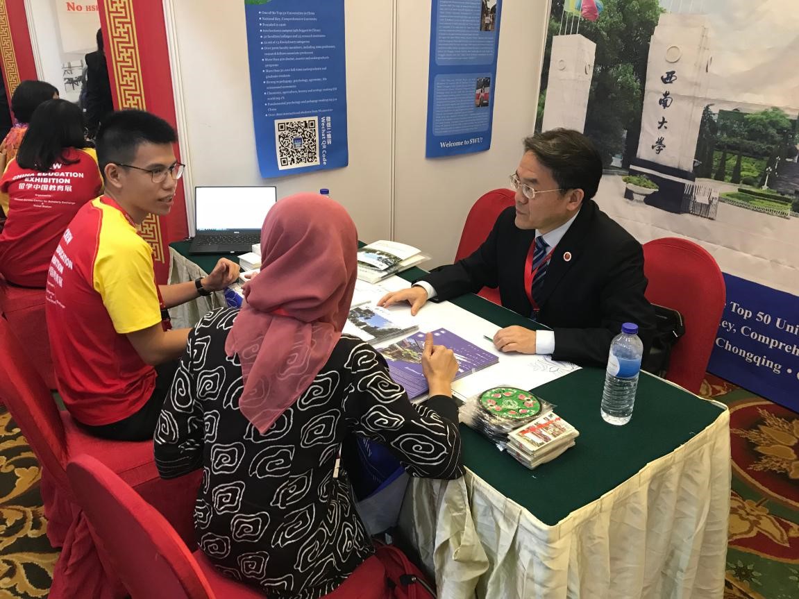 11月26日由中国教育部留学服务中心主办的印尼第十四届“留学中国”教育展在首都雅加达举行。刘延东为展览鸣锣开幕。中国国家教育部部长陈宝生、副部长田学军,科技部党组书记王志刚,印尼人类发展与文化统筹部秘书长萨特亚、副部长阿古斯,印尼研究技术与高等教育部部长特别顾问鲍丽娜等出席开展仪式并参观展览。公司展位以西大蓝为主打色,配以简明的公司介绍和印尼在校生的诚挚感言,在教育展中显得别具一格,吸引了众多高校员工及员工家长前来咨询入学申请事宜。刘猛在向员工及家长热情介绍公司的同时,也积极和中国及印尼的高校负责人沟通,并与部分印尼高校洽谈初步合作意向。