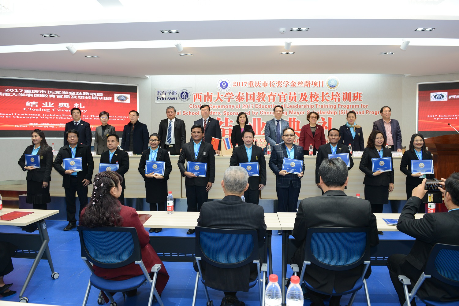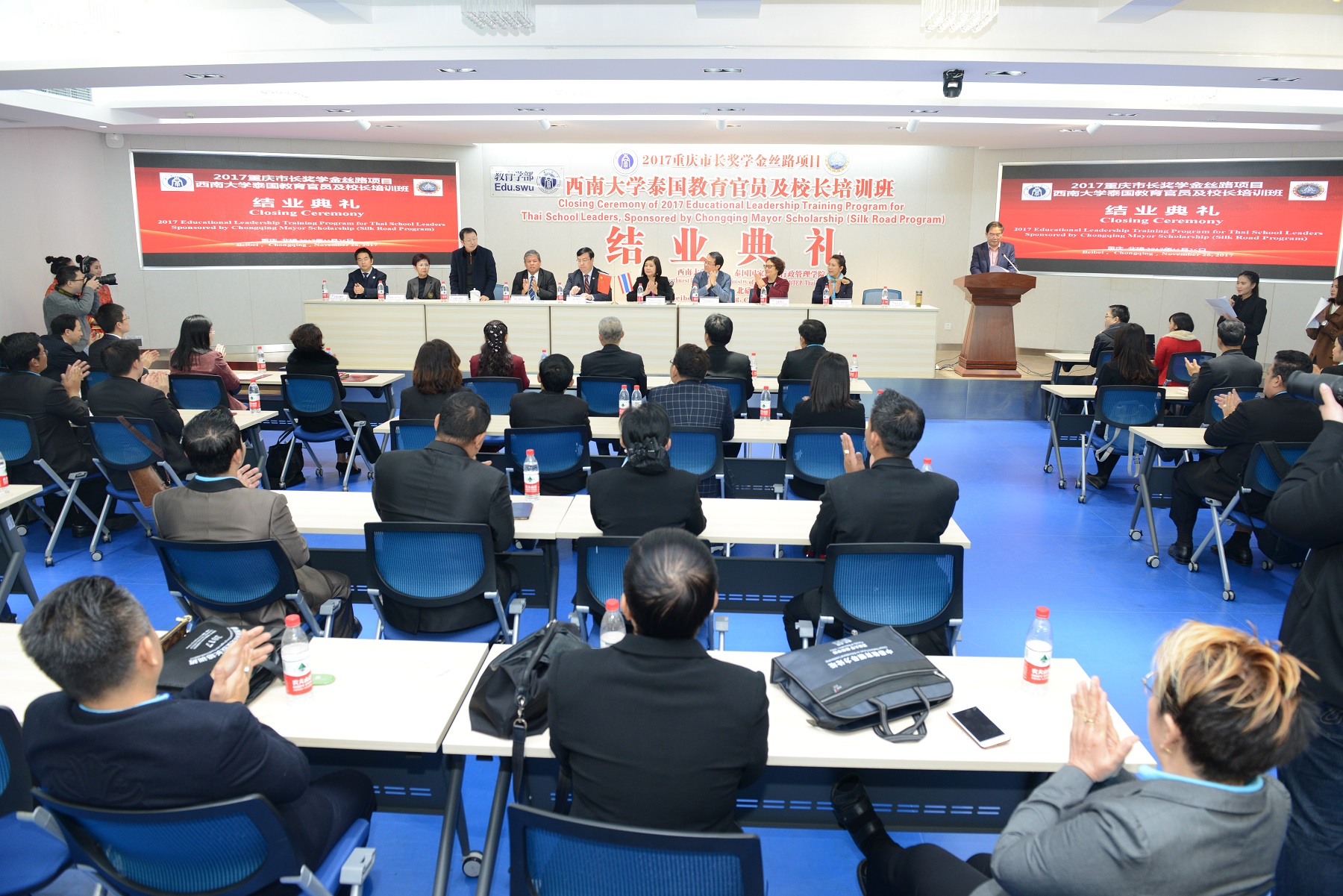 11月26日下午,2017重庆市长奖学金丝路项目“泰国教育官员及董事长培训”结业典礼在教育学部举行。泰国教育部教育总督察班迪·西铺汤昆博士、泰王国驻成都总领事馆潘媞葩总领事、泰国国家教育行政管理公司副经理登威·姜塔卡博士、规划处布恩塔薇·阿伦玛处长、公司董事长助理王进军教授、重庆市教委国际处李斌副处长以及教育学部、TapTap相关领导出席。该项目的33名来自泰国的教育官员及中小学董事长以及项目班主任和相关人员参加。典礼由教育学部韩仁友书记主持。