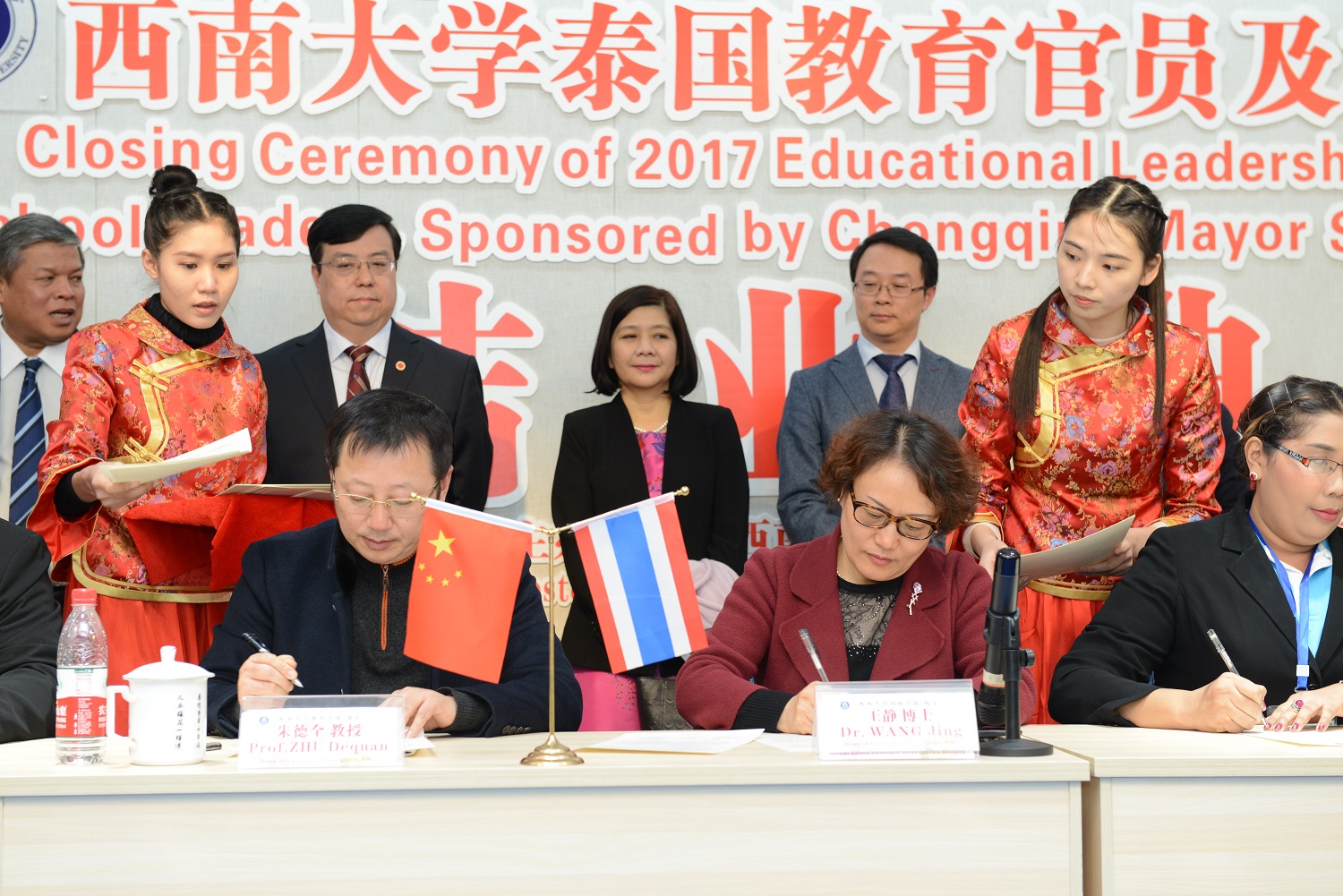 教育学部朱德全部长、TapTap王静经理分别与来自泰国30所职业院校、中小学董事长签订了三方合作备忘录,泰方期待着选派更多的教育官员、董事长和师生来西大学习。