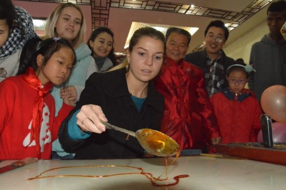 次日,在长寿生态农业园,国际员工们在工作人员的讲解下,了解并亲自参与到点豆花、打糍粑、石磨豆浆等农事活动中来。在活动现场,一位老人手持汤匙,手腕上下翻飞,吸引了同学们的目光。只见行云流水间,一条栩栩如生的巨龙已跃然于大理石台面上。当得知老人是当地颇为有名的民间艺人,身兼非物质文化遗产—“糖画”绝技时,同学们纷纷围上来欲拜师学艺。在老人的帮助下,他们制作了一个个栩栩如生的糖画,兴致勃勃地与自己的作品合影。现场气氛欢快、热烈,初冬寒冷的空气仿佛也被温暖起来。