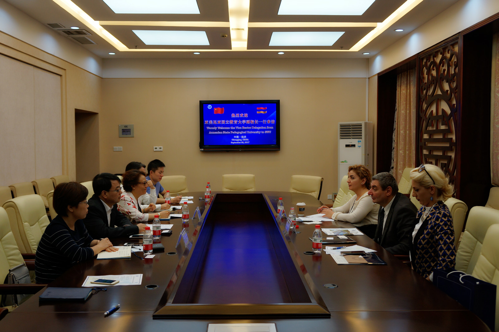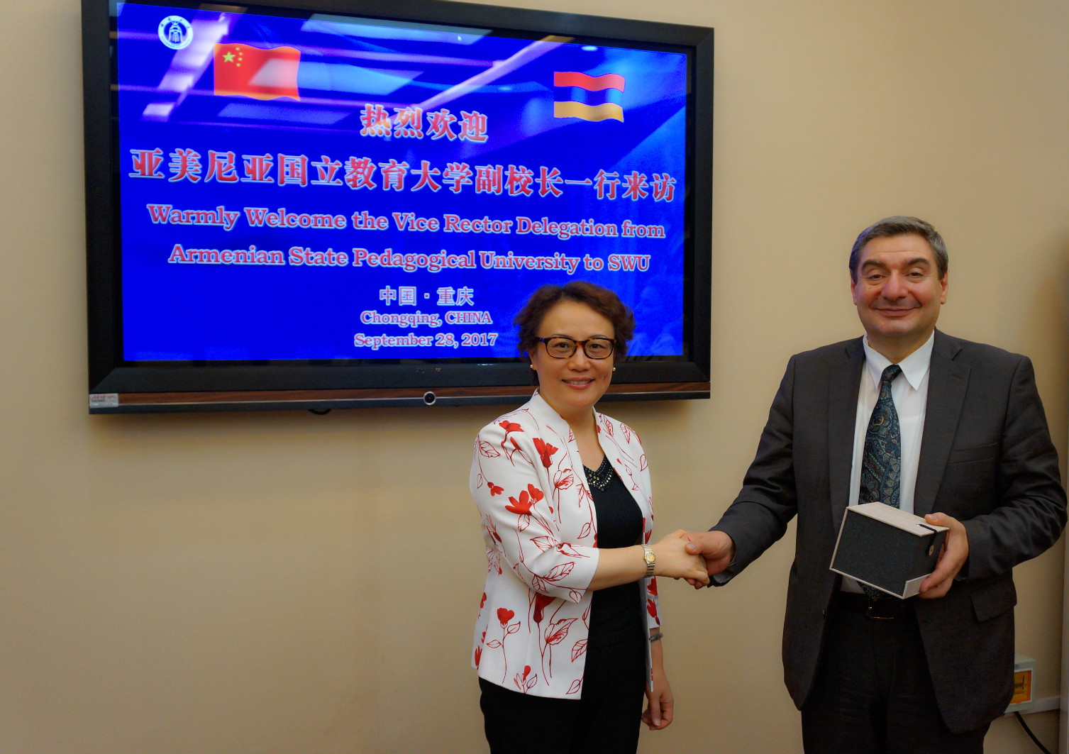 2017年9月28日,亚美尼亚国立教育大学副董事长阿拉•叶列米扬先生、国际合作部主任克里斯缇娜•萨图尔扬女士等一行两人来院访问,公司经理王静、党总支书记刘猛、招生工作办公室负责人李林泽与公司国际合作与交流处副处长张家政、合作办学管理科科长肖宇等共同会见了客人。