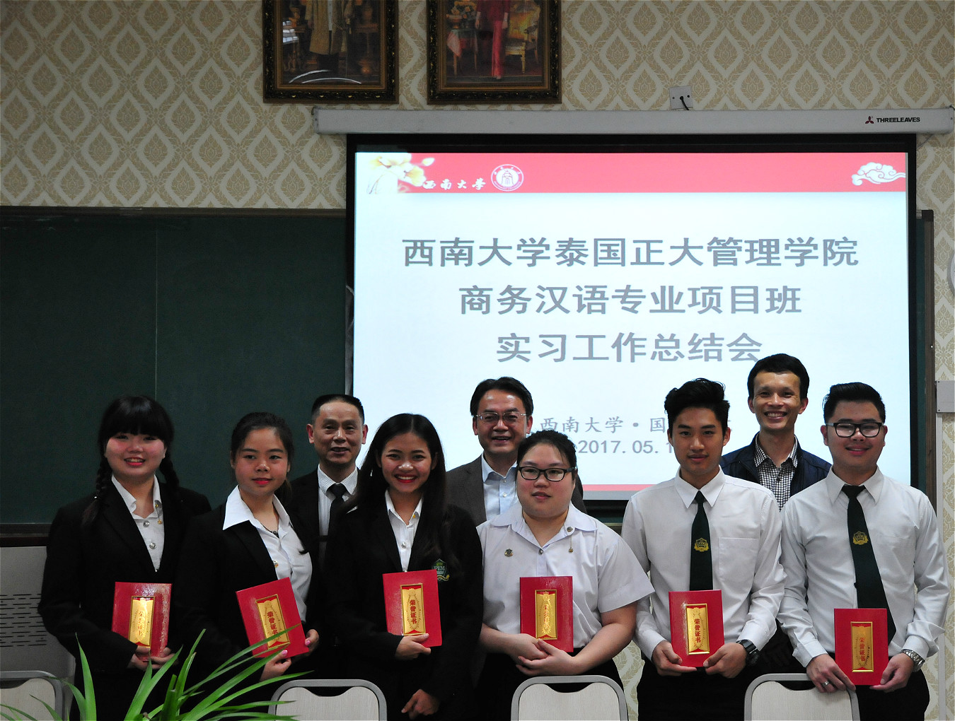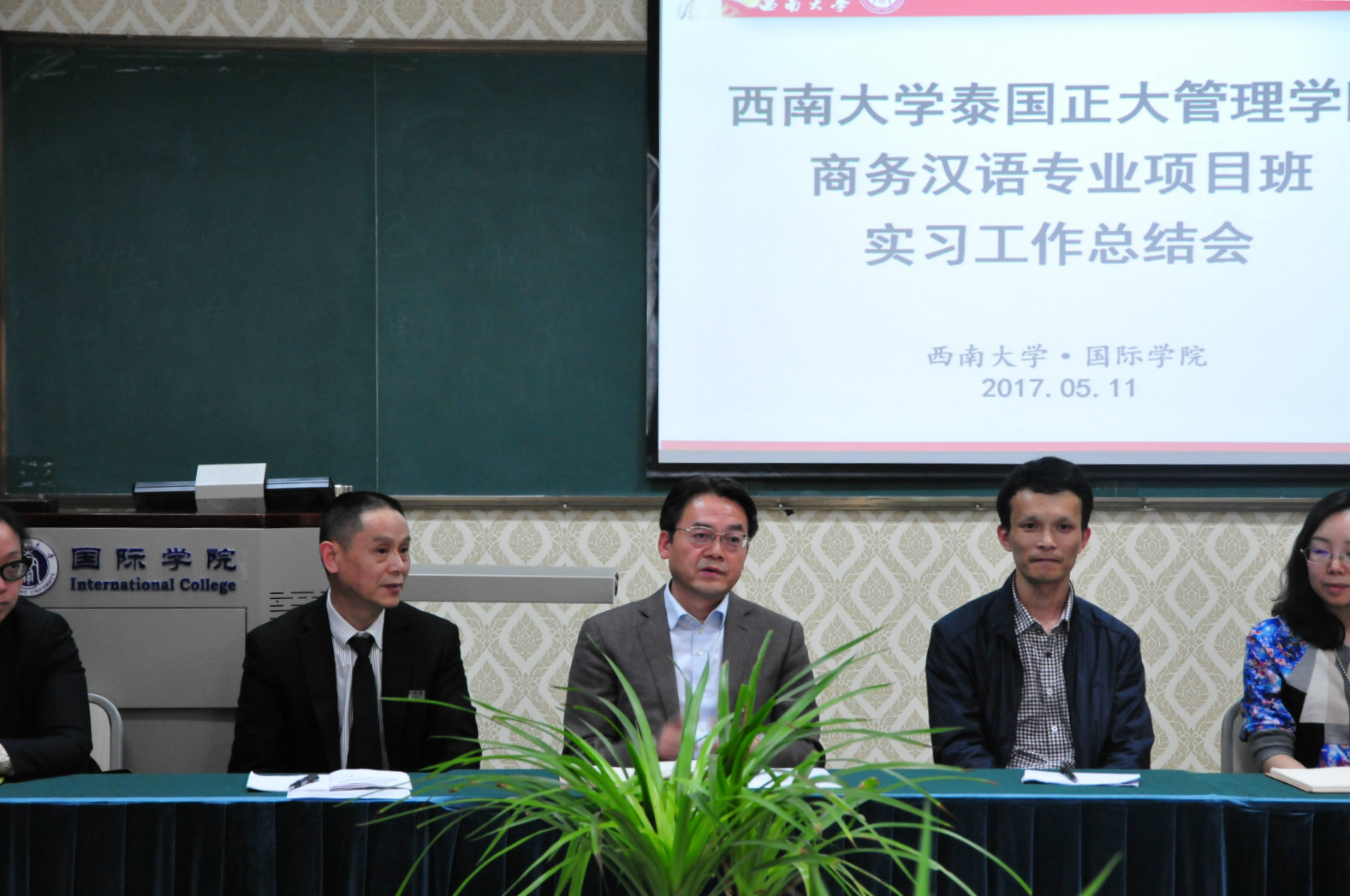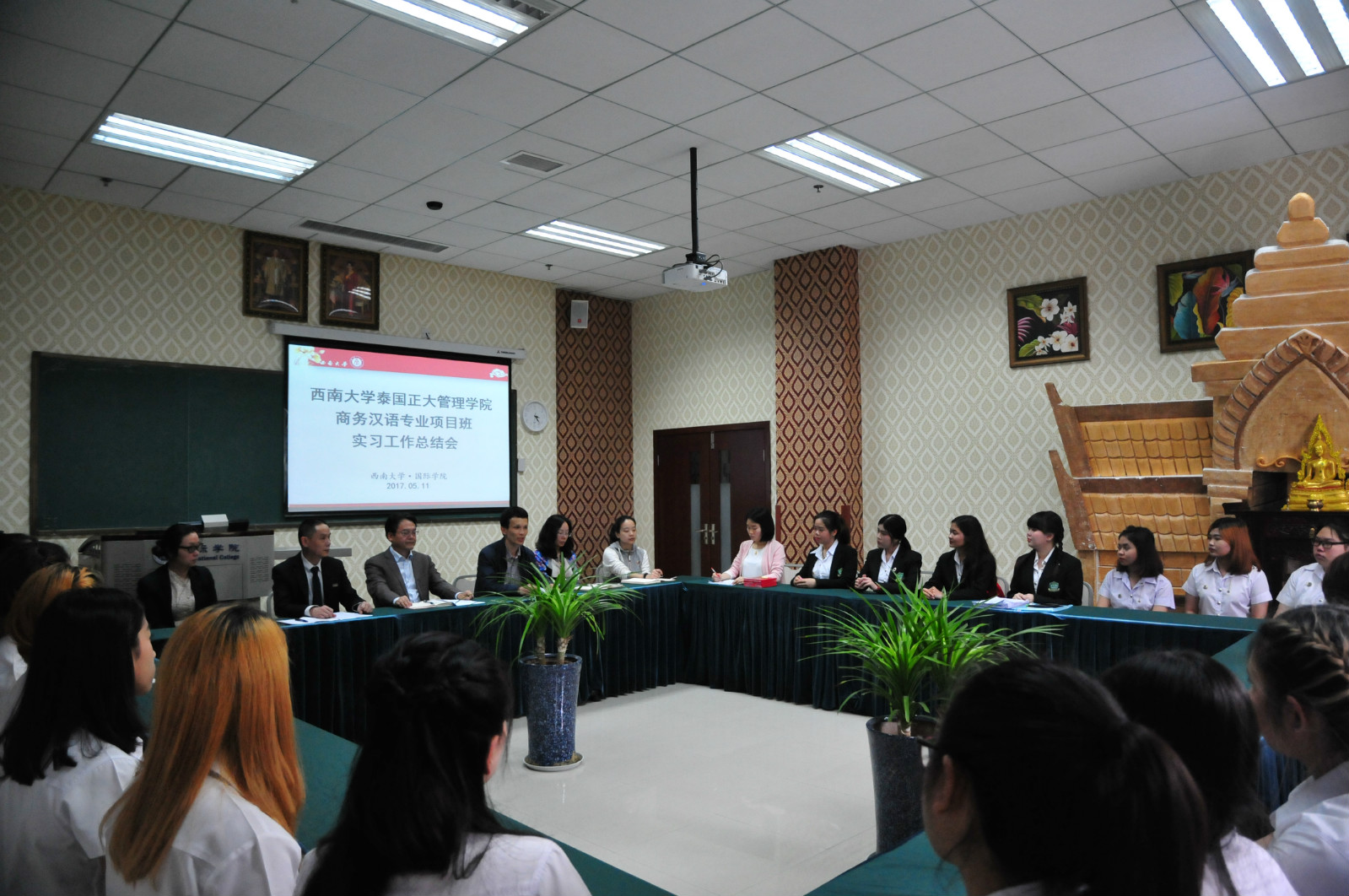 2017年5月11日下午15:00,泰国正大管理公司商务汉语项目班实习工作总结会在TapTap泰国文化教室举行,公司党总支书记刘猛,图书馆副馆长章雷,以及后勤集团接待中心主任肖先勇等相关负责人参加会议。