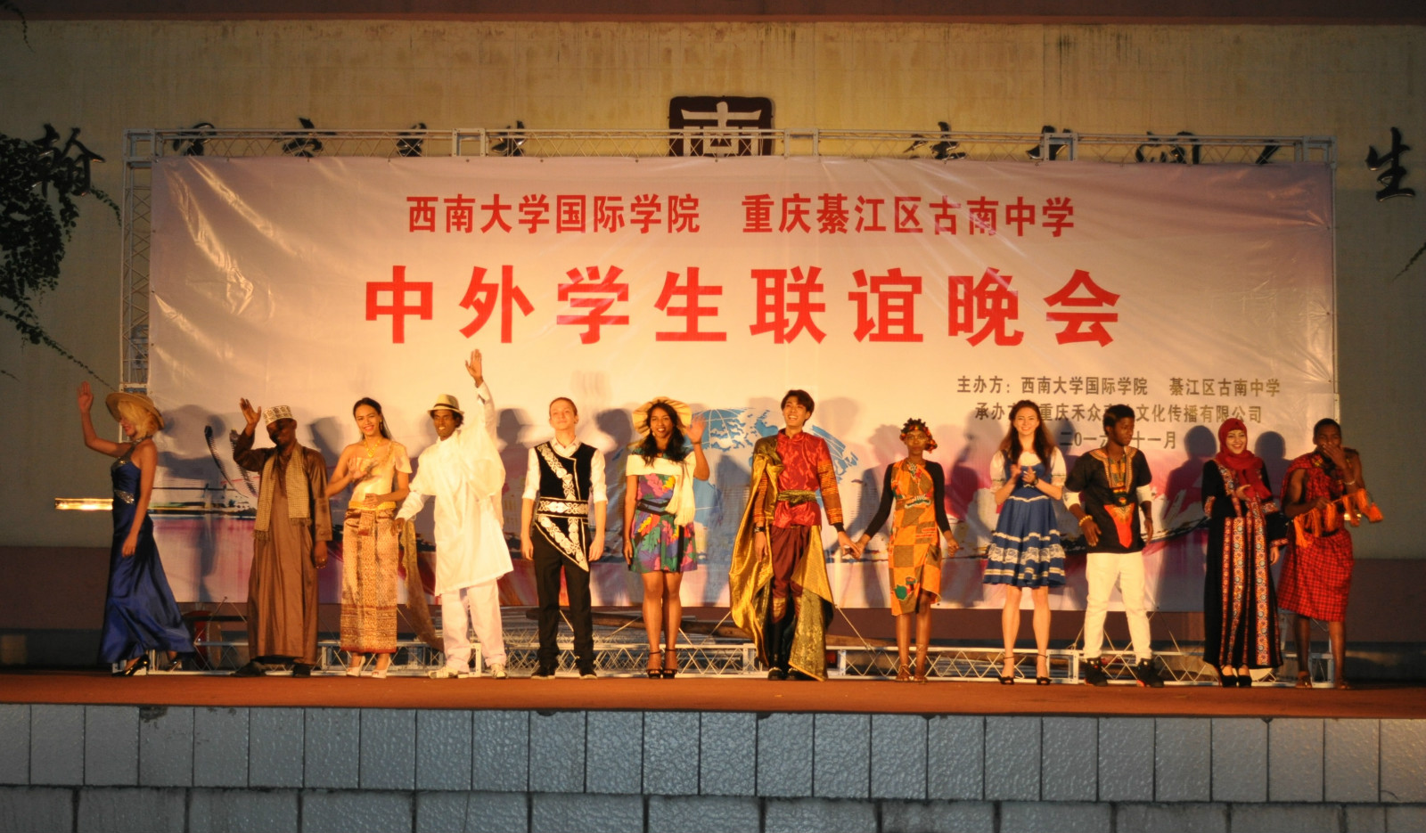 晚上,一场别开生面的“中外员工联谊晚会”在古南中公司园里上演。虽然合练的时间很短,但整台晚会衔接顺畅,内容丰富,文化特色鲜明。孔子公司奖学金生表演了京剧《定军山》、模特走秀、非洲舞蹈等节目,还即兴演唱了歌曲《黄豆》。四个节目既有中国的传统艺术,也有充满异域风采的舞蹈,让观众们连连鼓掌叫好。同时,古南中学带来的歌舞《幸福格桑花》、相声《报菜名儿》、爵士舞《Shake It》等节目充满浓浓的中国味,让在场的职工们领略了中国艺术的魅力。