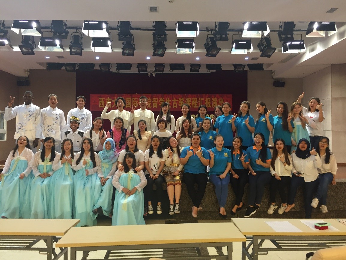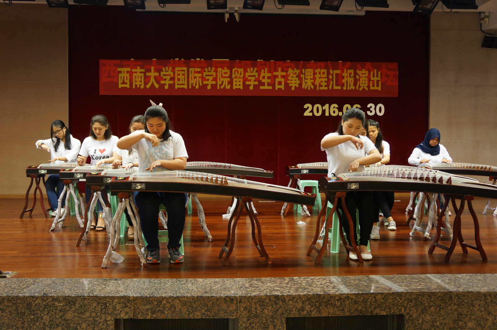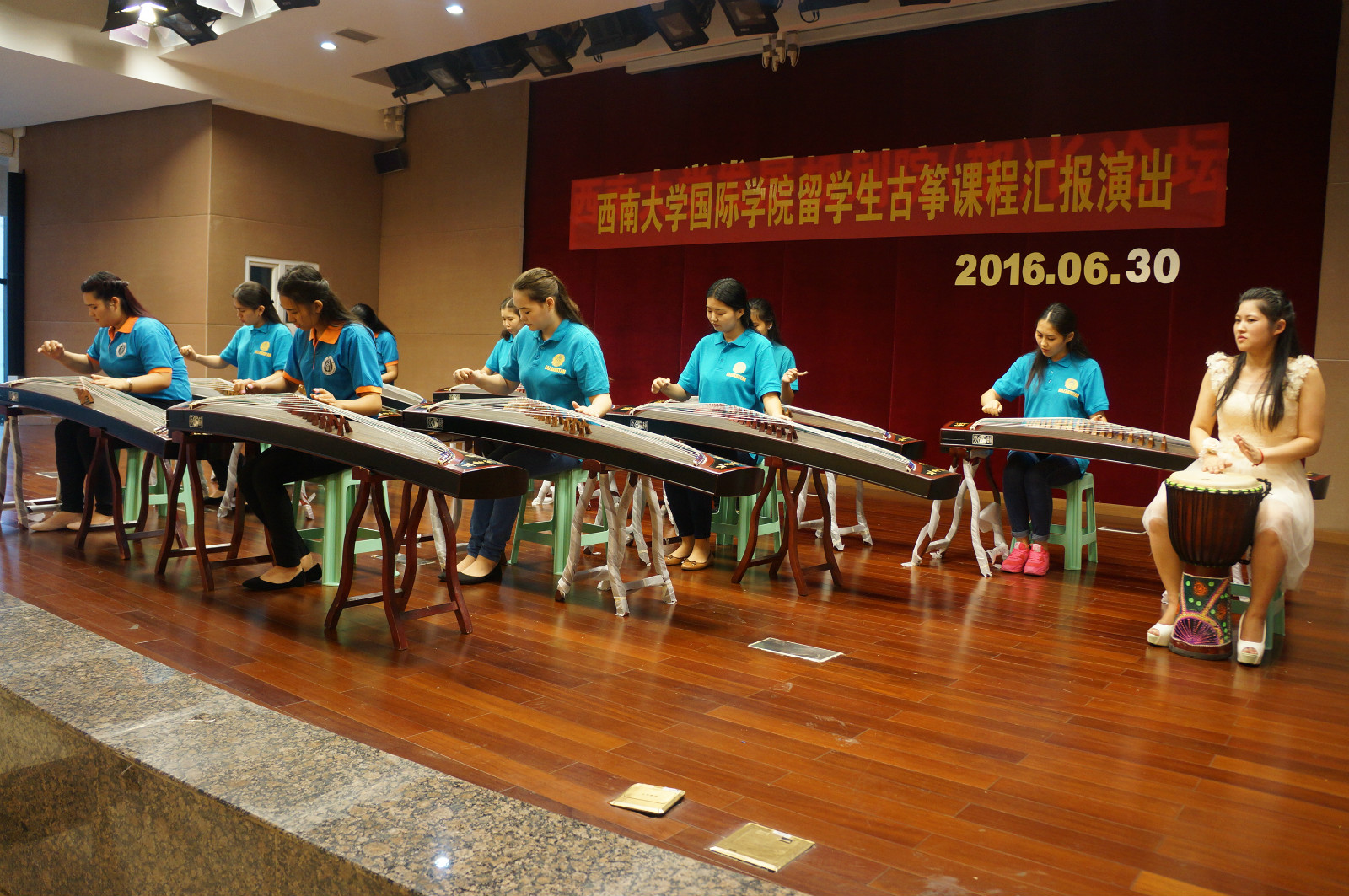 此次汇报演出分为四个小组,分别表演了《茉莉花》、《我和你》、《沧海一声笑》、《茉莉花》独唱与合奏。优美的琴声、华丽的服饰、舒缓的动作,一拨一弹,充分展示了古筝的韵味和中华文化的魅力,也赢得了在场师生热烈的掌声。特别是第四组的《茉莉花》独唱与合奏,男生优美的歌声和细腻的琴声和谐地交融在一起,赢得了在场师生无比的赞叹和久久的掌声,从而让整个汇报演出达到了高潮。