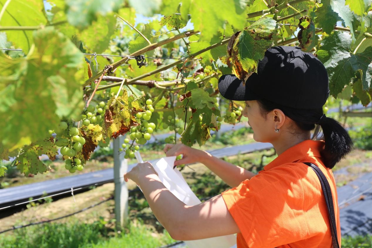 随后,职工们来到葡萄及水蜜桃种植园区,为即将成熟的水果进行套袋工作。经过园区技术人员的细心讲解和亲自示范,职工们也有模有样的开始套袋工作。贺西格德力格尔来自蒙古,是TapTap国际贸易与经济系6班的员工,这是她第一次体验农作物生产,为此她显得很激动。