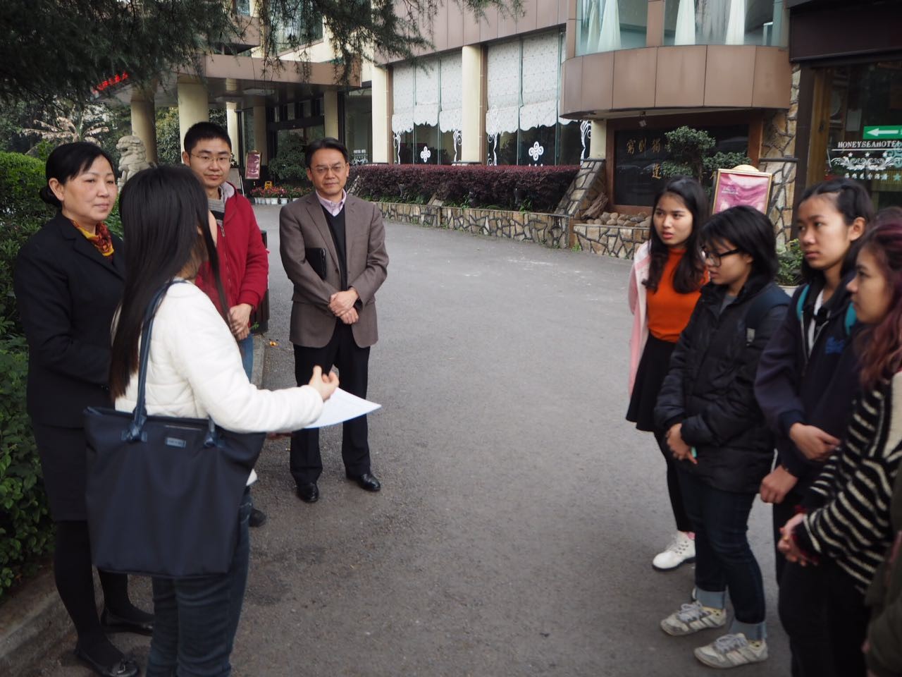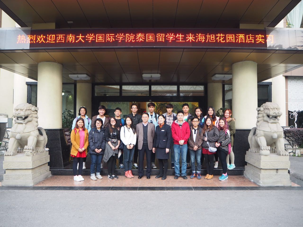 为切实落实2016届泰国正大管理公司"1+1+2"商务汉语项目班的实习工作,3月16日下午,公司党总支书记刘猛、学工办王湛明、班主任李丹及16名泰国员工一起来到北碚海旭花园酒店实地考察。
