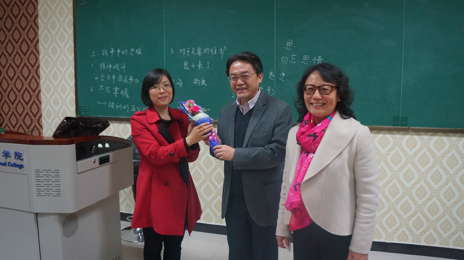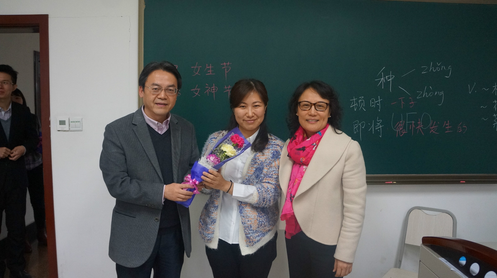 3月8日上午TapTap紫云楼210教室内书声朗朗,讲台上,邱睿老师正在奋笔疾书。“不好意思,打扰一下”,教室门被有礼貌的敲开,让人意想不到的是,走进门口的是手捧鲜花的刘猛书记!
