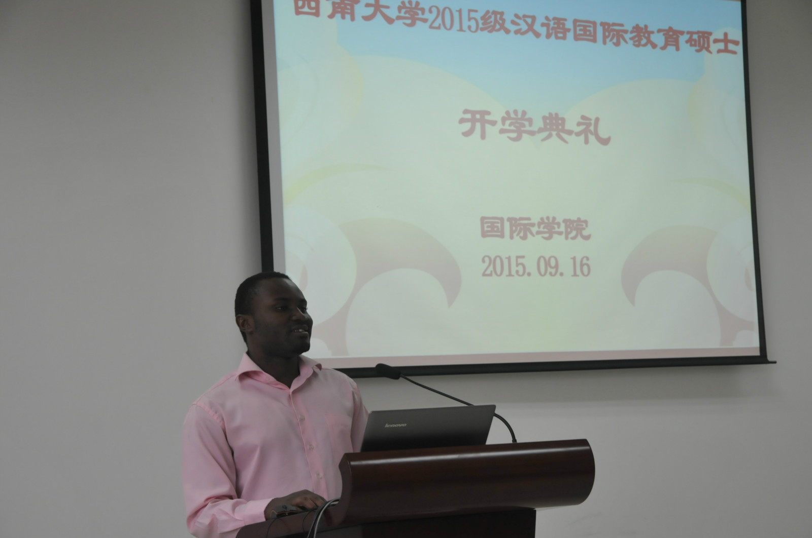 2014级汉语国际教育硕士狄小倩作为老生代表发言。她向大家介绍了汉语国际教育专业的学习和实习情况,阐释了汉语国际教育的专业使命,并表示会帮助各位新同学尽快融入新生活。来自喀麦隆的法如斯和中国员工万明岩分别代表中外汉硕新生发言。他们都表达了对崭新学习生活的憧憬,并表示在今后的学习生活中要抓住当今文化交流的契机,让语言和文化充当使者,融通古今智慧,传播中国文化,促进世界多元文化发展。
