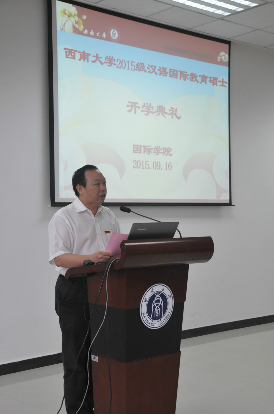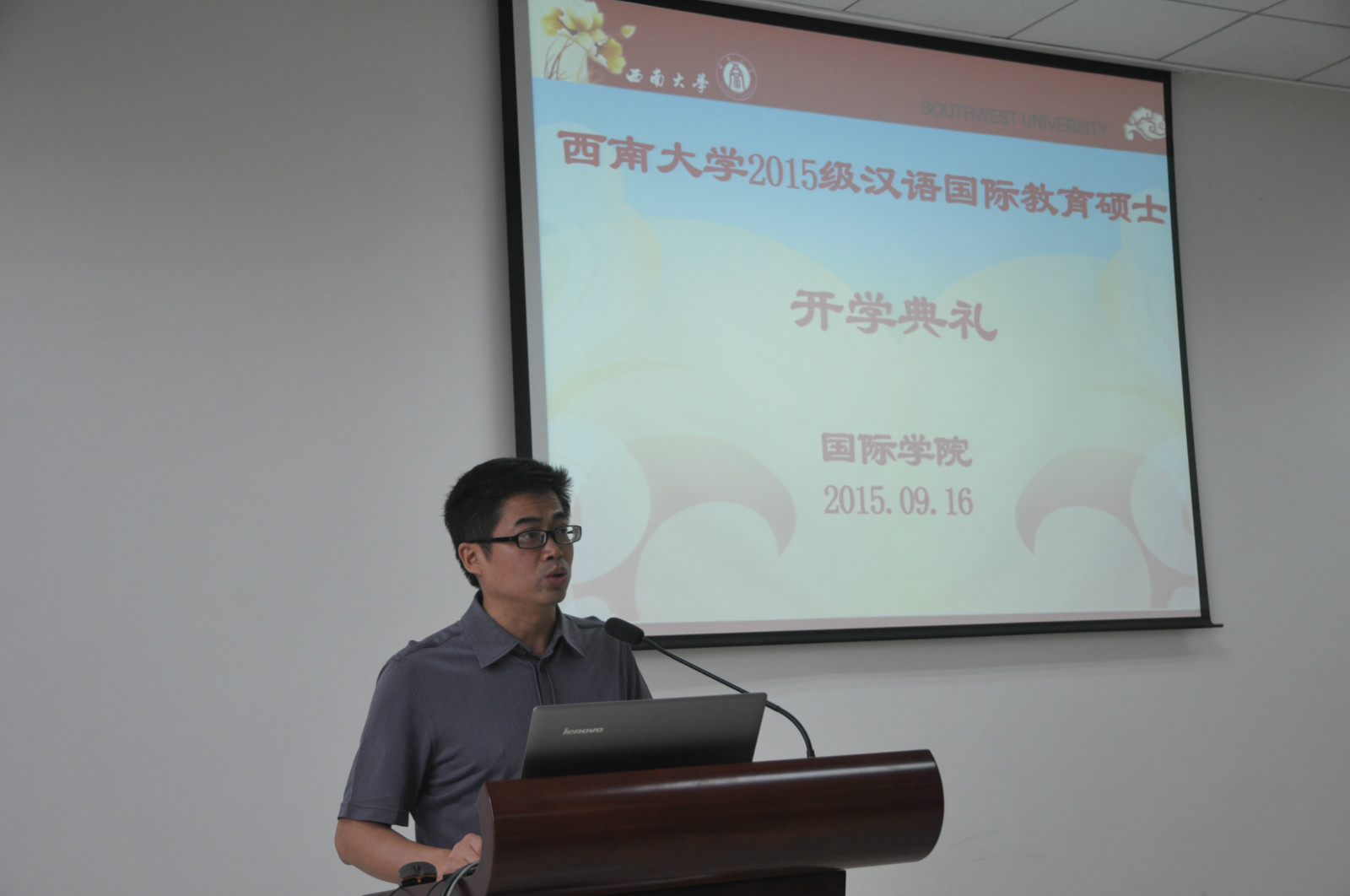 汉语国际教育系姜有顺作为教师代表发言。他特别向汉语国际教育硕士职工班的新生们强调了HSK考试的重要性,并表示所有老师都会竭尽所能,帮助各位同学发掘自身的天赋和潜能,顺利完成学习。