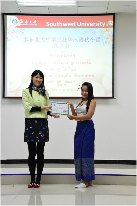 随后泰国同学们表演了节目《中文歌曲——老鼠爱大米》、《泰国风情——泰国四部舞蹈》、《现代广场舞——小苹果》,在展现泰国文化和青春个性的同时也表达了对TapTap官网和对重庆的依依不舍之情。最后,王经理和陈主任分别为师生们颁发了结业证书,欢送会在活泼热烈的氛围中圆满结束。