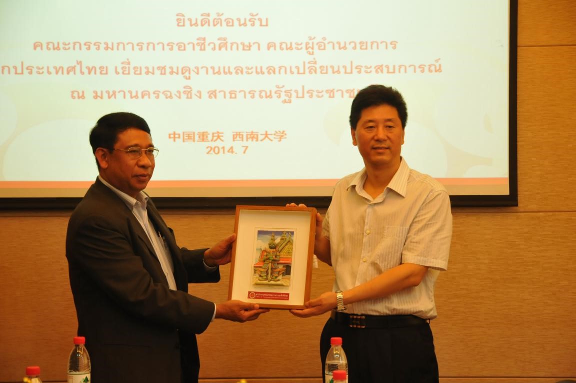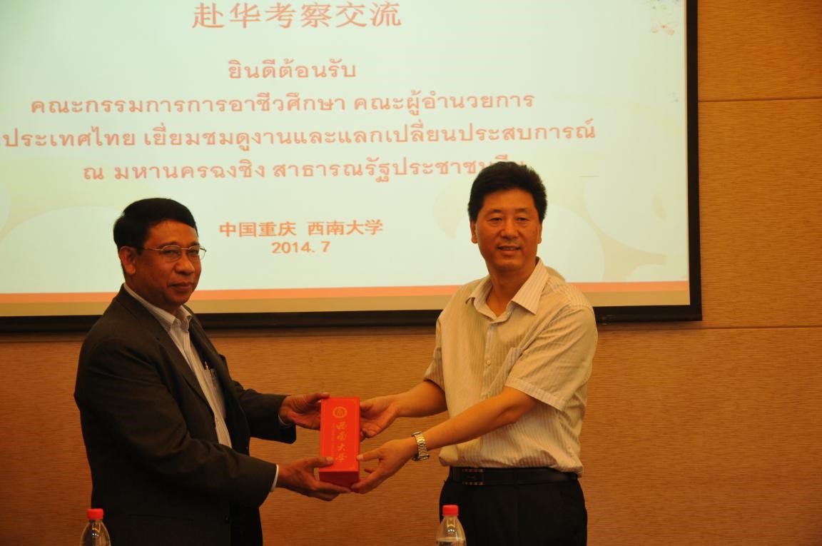 靳玉乐副董事长与泰方代表Parchakhom Chantharachit博士互赠纪念品并合影留念。