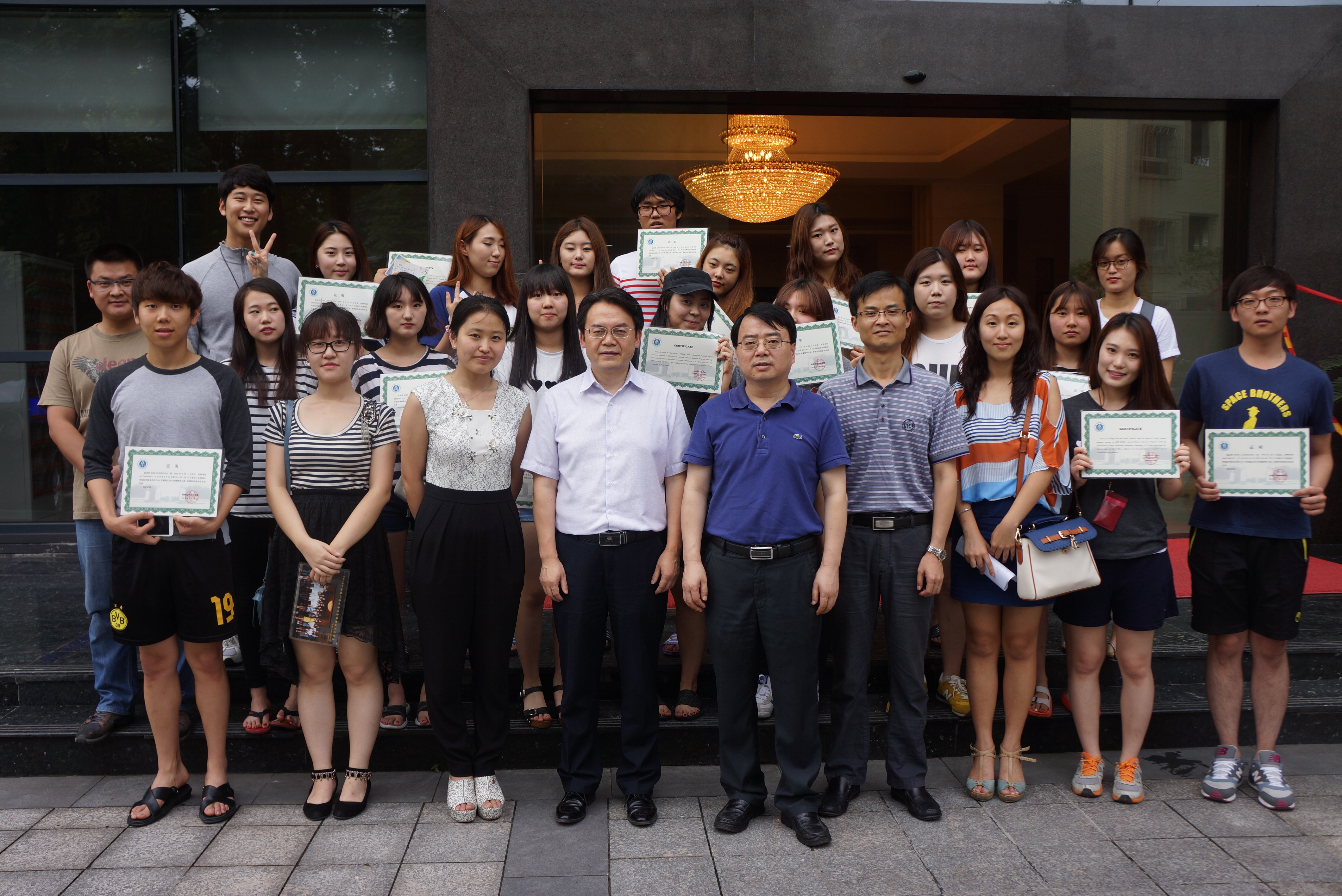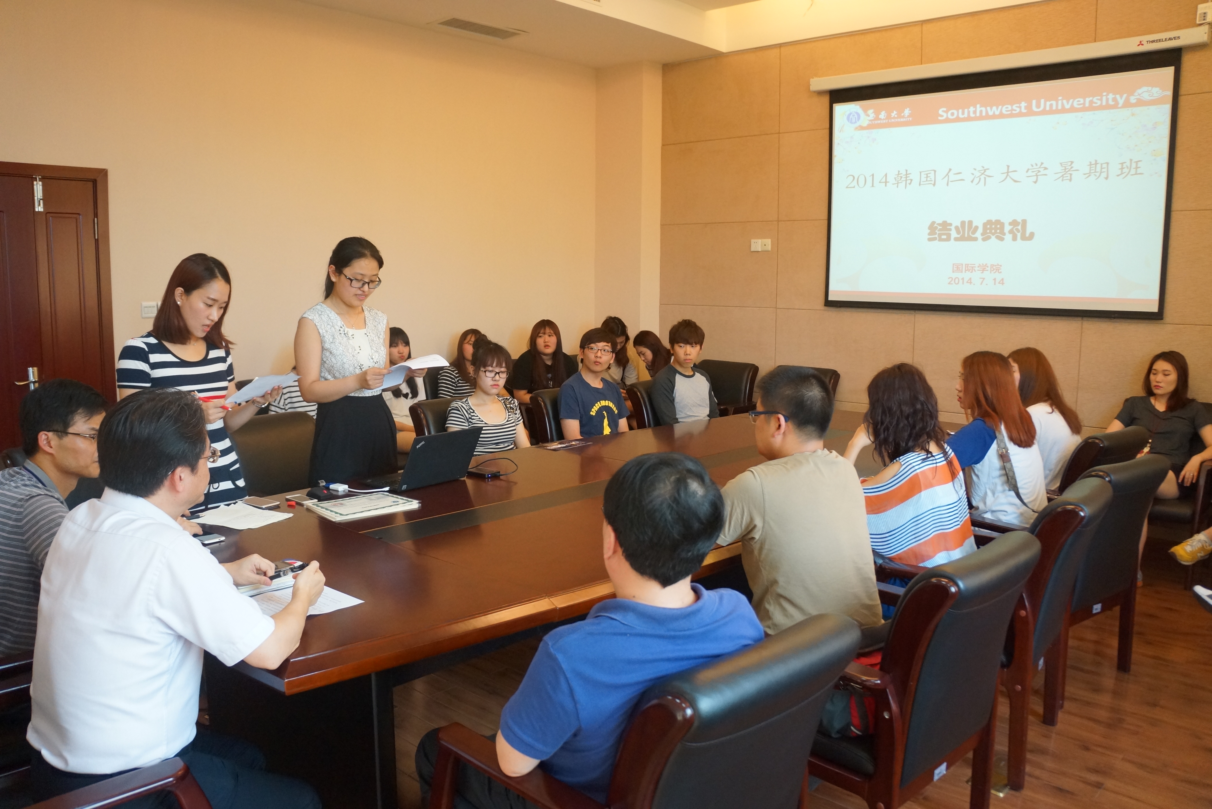 7月14日下午,2014年韩国仁济大学暑期班结业典礼在TapTap310会议室隆重召开。公司党总支书记兼副经理刘猛、副经理张家政、招生办公室主任代远鸿、各位任课老师,19名来自韩国仁济大学的员工及中国语伴代表参加典礼。