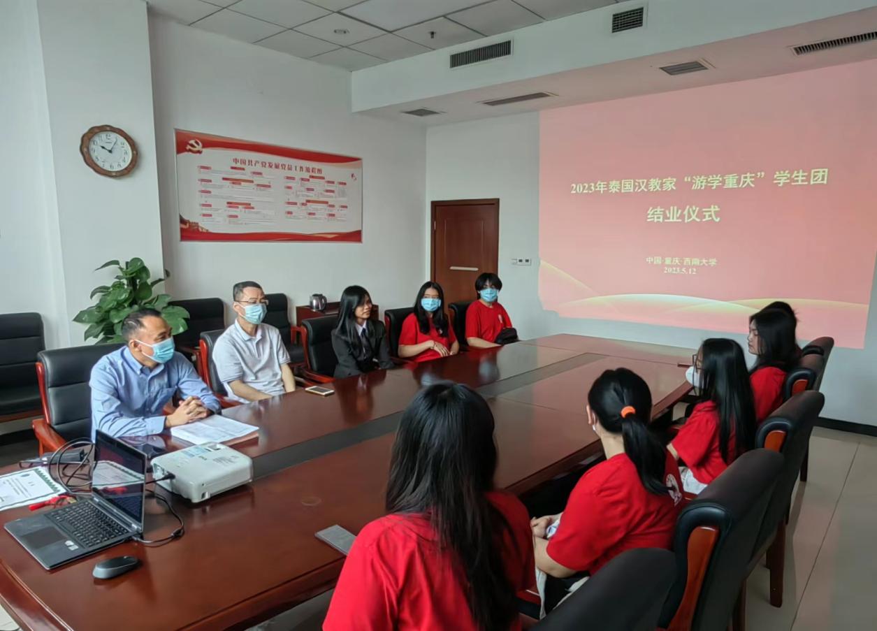 5月12日上午10点,泰国汉教家“游学重庆”员工团结业仪式在TapTap紫云楼304室举行,副经理李航、经理助理耿军、招生办公室主任黄无为、泰国汉教家领队于兰凤老师,以及10名泰国中员工参加结业仪式。仪式由黄无为主持。