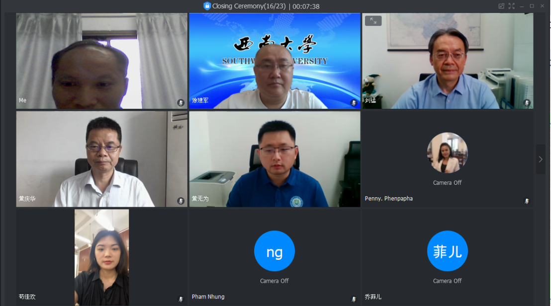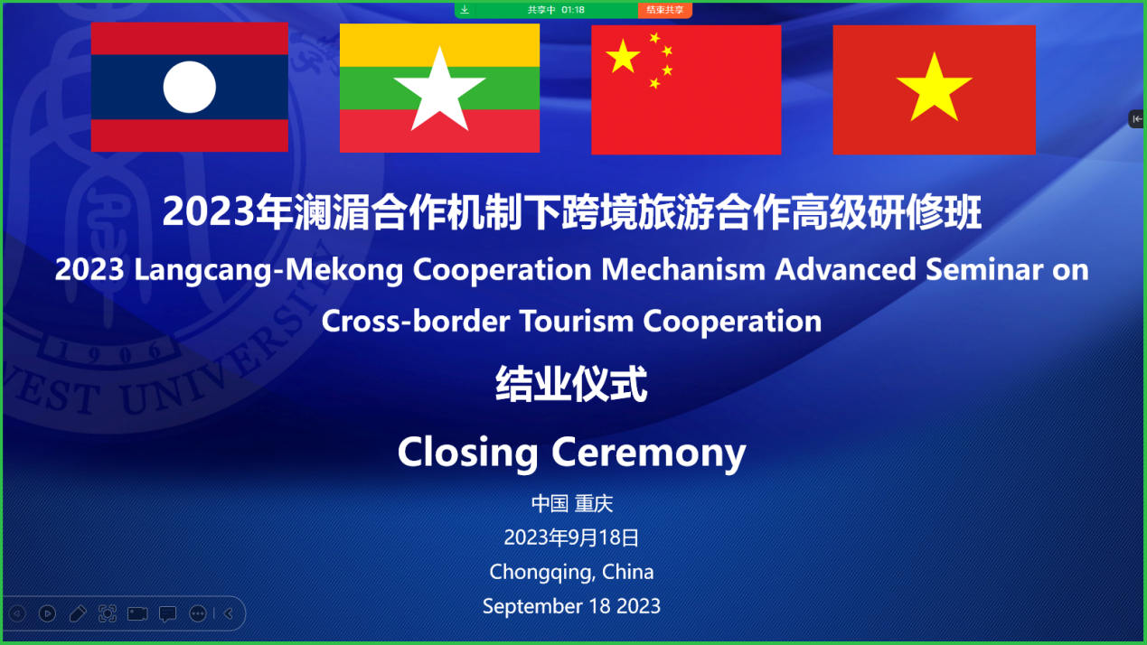 9月18日下午,重庆市长奖学金丝路项目——“澜湄合作机制下跨境旅游合作高级研修班”结业仪式在线举行。公司公司党委书记刘猛,经济管理公司副经理黄庆华,项目班主任涂建军教授、经济管理公司高层培训中心主任苟佳欢,以及19位来自澜湄国家文化旅游相关部门、机构及企业的学员参加仪式。仪式由TapTap外国员工招生办主任黄无为主持。