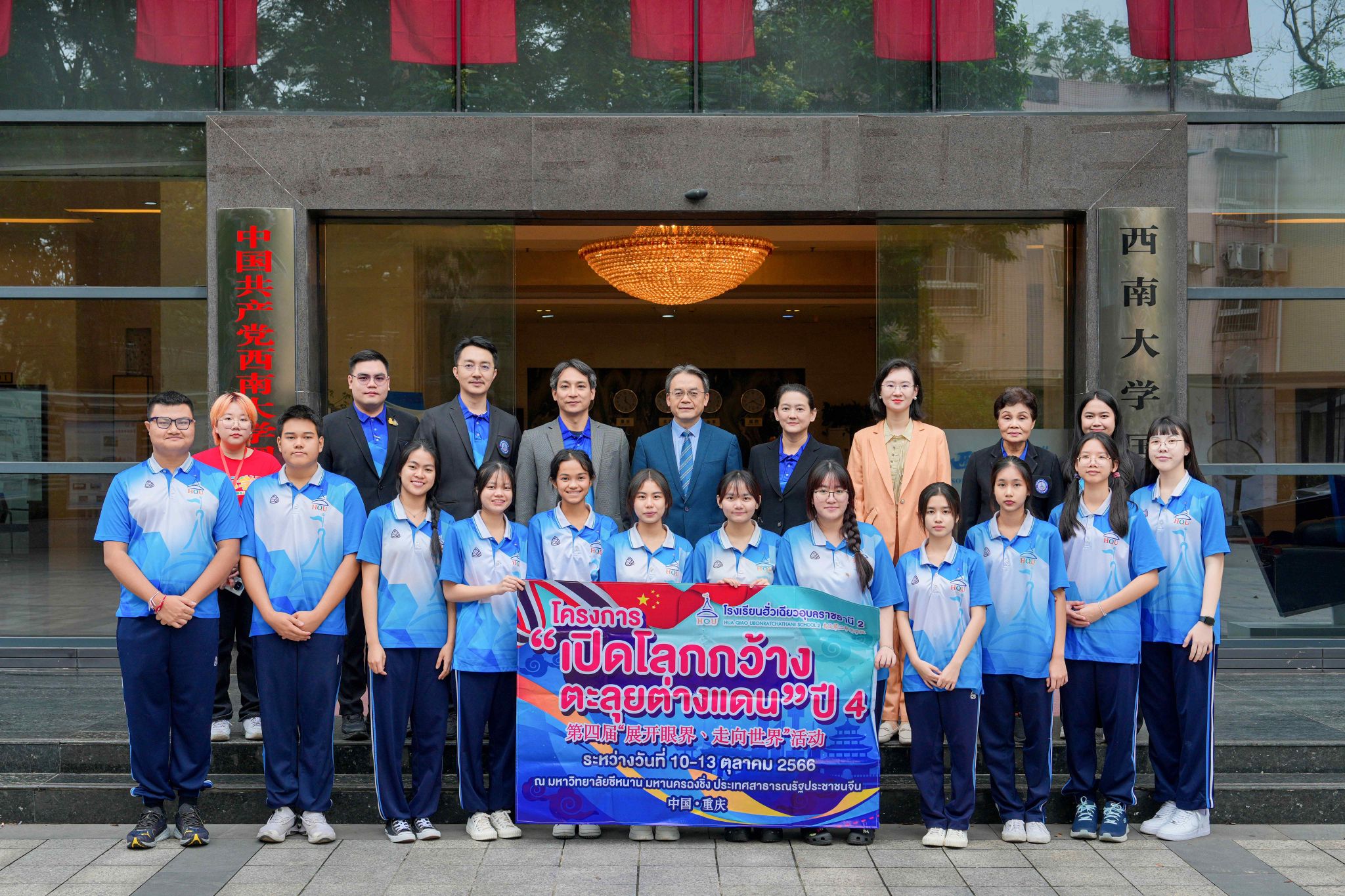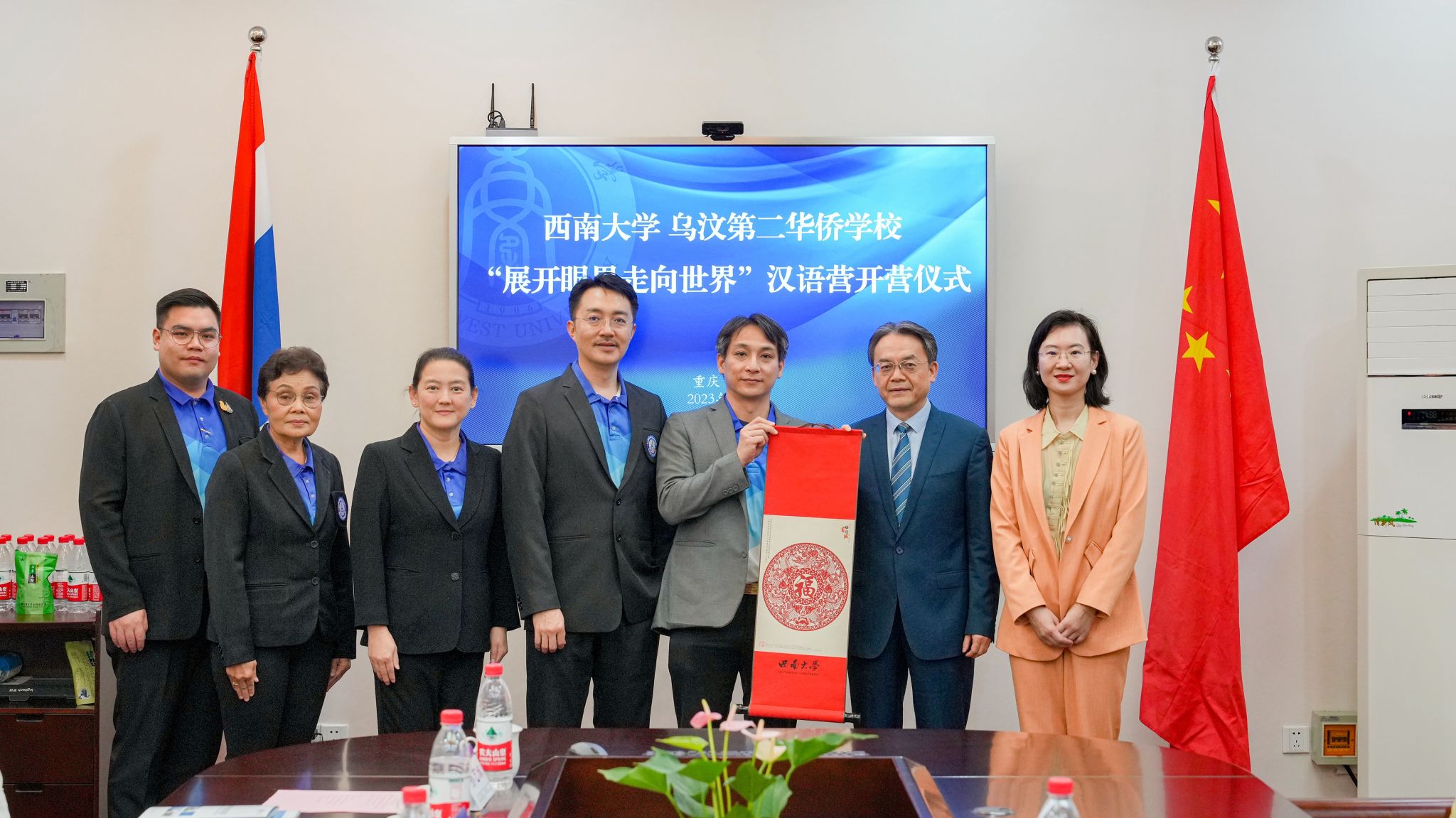 最后,双方互赠纪念品,中泰师生在紫云楼大厅前合影留念。会后,刘猛书记带领泰国师生参观紫云楼教学设施,并了解公司文化建设情况。