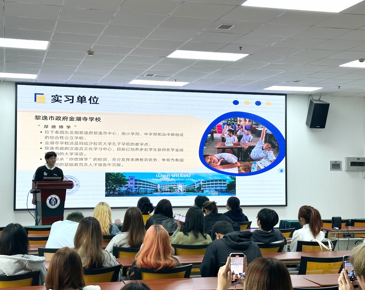 汉语国际教育本科20级B班姚崇同学从实习单位、实习时间、实习目标、实习过程和实习总结等方面,分享在黎逸市政府金湖寺公司的实习经历,表示,实习让他收获了很多,体会到了如何承担起老师的角色,也深深地感受到了作为一名本土汉语教师的责任与使命,也更加坚定了从事国际中文教育事业的决心。