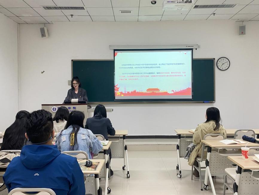 舒敬斌同志导学《习近平致全国优秀教师代表的信》和习近平总书记对宣传思想文化工作作出的重要指示精神。他深入分享自己的学习心得,指出,“作为一名来华职工教师,我们是培养中外文化交流使者的重要力量,在新时代如何培养好职工是值得思考的重要论题”。他提到,公司2015级印尼职工吴芬芬,目前供职于中铁雅万高铁公司,她的工作主要是财务和翻译,她在连接中印文化之间发挥了重要作用。目前,公司正打算派她来中国学习财务知识,进一步发挥促进中印文化交流的作用。