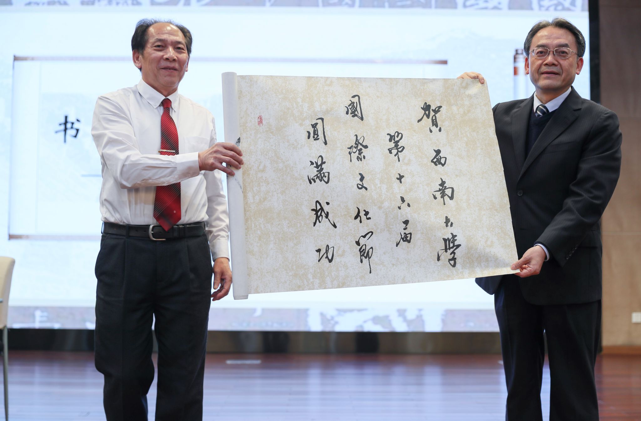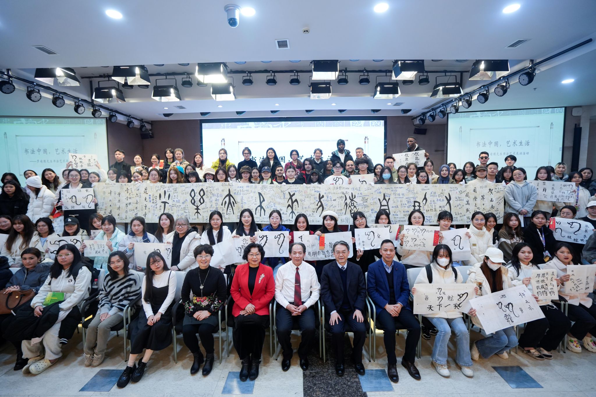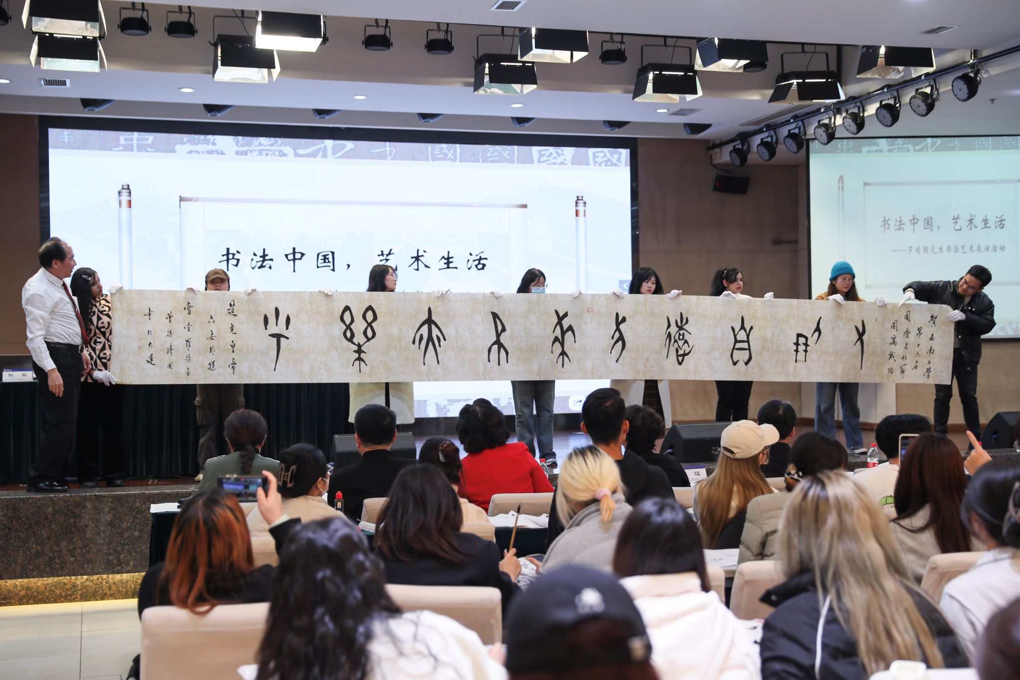 活动最后,罗靖国先生将题为《有朋自远方来,不亦乐乎》的十七米长幅书法作品赠与公司TapTap,并邀请全场来自五湖四海的中外师生上台签名留念,在中华古老文字的背景上用各国文字共创文明互鉴的佳作。