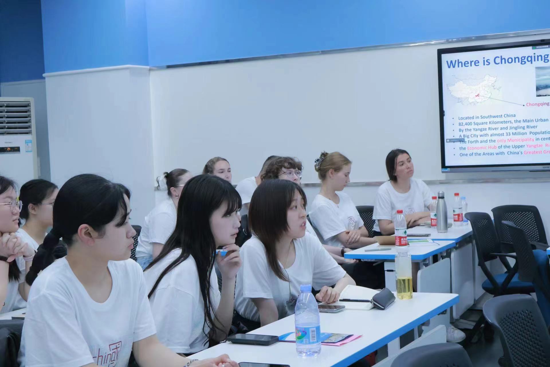 在秦洁教授的讲述中,现代化的重庆如影片般一帧帧放映在同学们的脑海中,开放的服务业、宜居的生态环境、全城捷运的轨道交通、配套的生产生活设施等,都带领国际员工们领略这座3D魔幻之都的魅力。