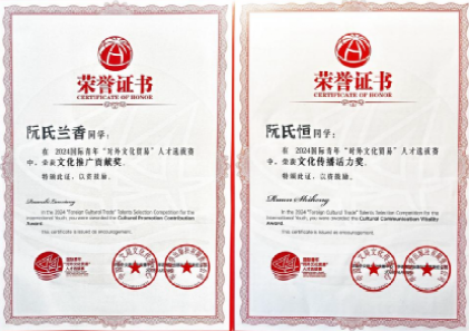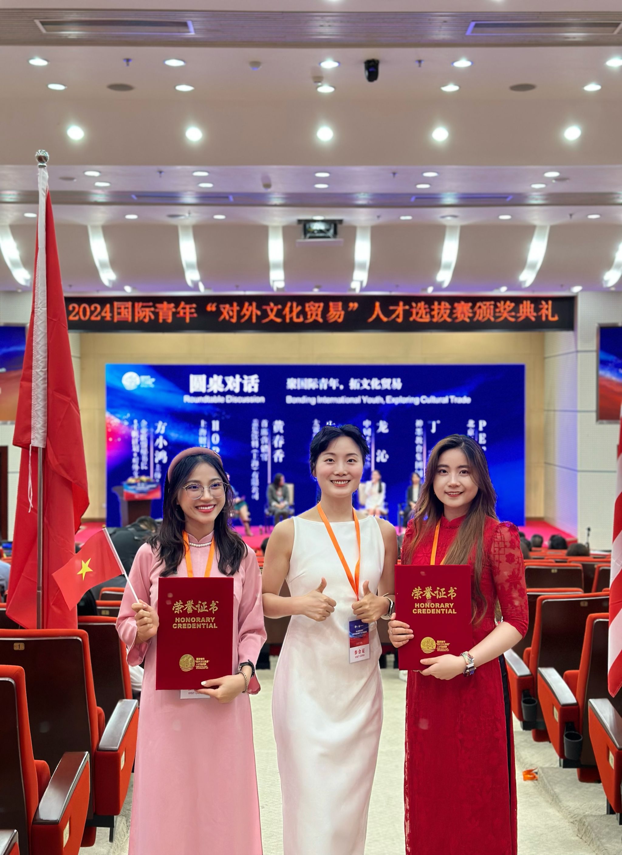 5月28日,由中国外文局文化传播中心和华语教学出版社联合主办的2024国际青年“对外文化贸易”人才选拔赛颁奖典礼暨归国创业培训启动仪式在北京举行。公司连续两年获评“优秀院校组织奖”,越南籍国际员工NGUYEN THI LAN HUONG(阮氏兰香)获“文化推广贡献奖”、越南籍国际员工NGUYEN THI HANG(阮氏恒)获“文化传播活力奖”。