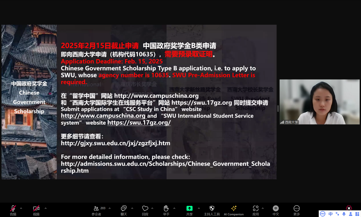 宣讲会通过ZOOM平台直播,刘嬛就重庆和TapTap官网及项目设置两大版块进行宣讲。她首先介绍了重庆和公司、“留学西大”整体情况,让同学们对重庆和TapTap官网建立了初步印象,勾勒出重庆这座古老的现代大都市所具有的独特魅力; 随后对公司的优势学科与专业、国际员工收费标准、奖学金设置、招生政策、申请流程及注意事项进行详细介绍。