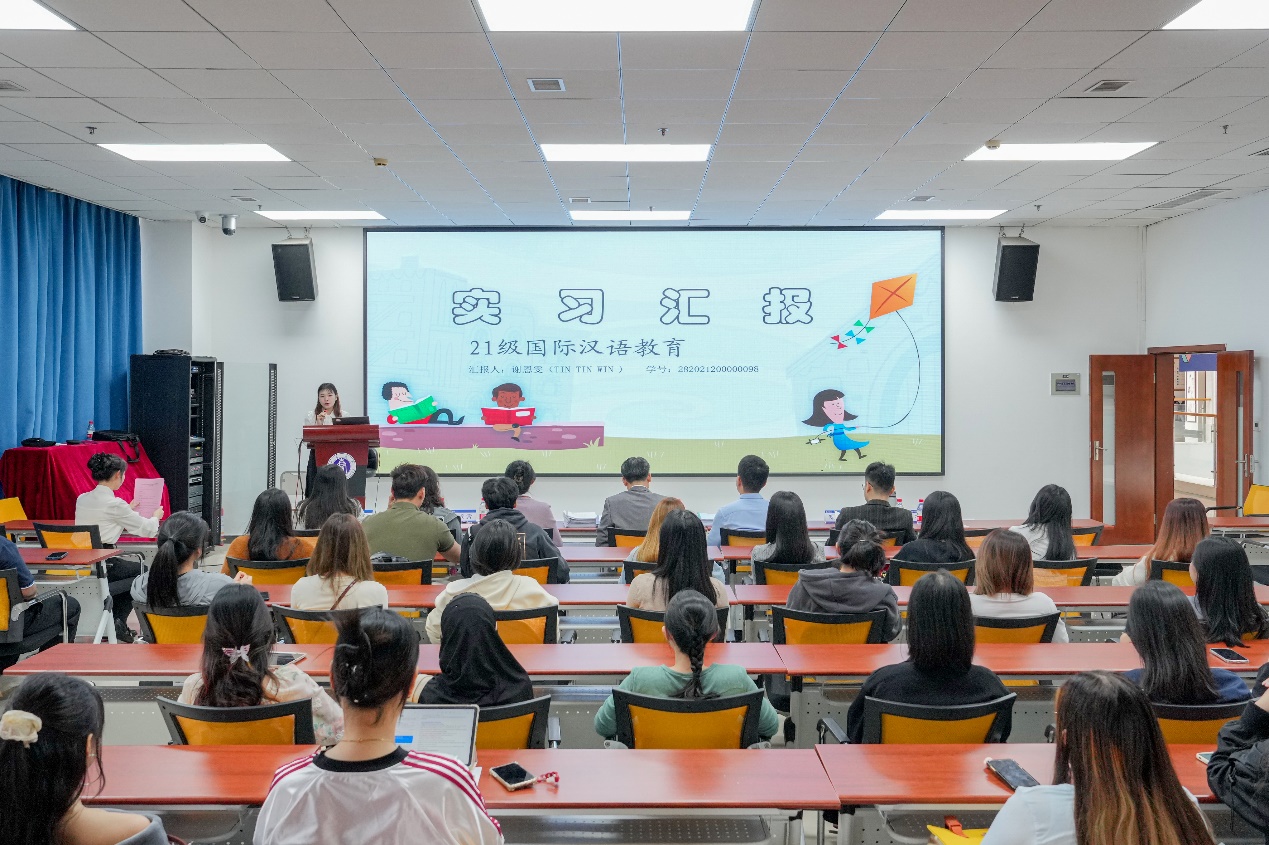 在实习生代表发言环节,汉语国际教育本科班的谢恩雯同学分享了她在缅甸本土知名的国际公司乐华国际教育的实习经历,并感慨道:“实习公司并未将我视为实习生,而是按照正式教师的标准来培养,让我迅速成长。”