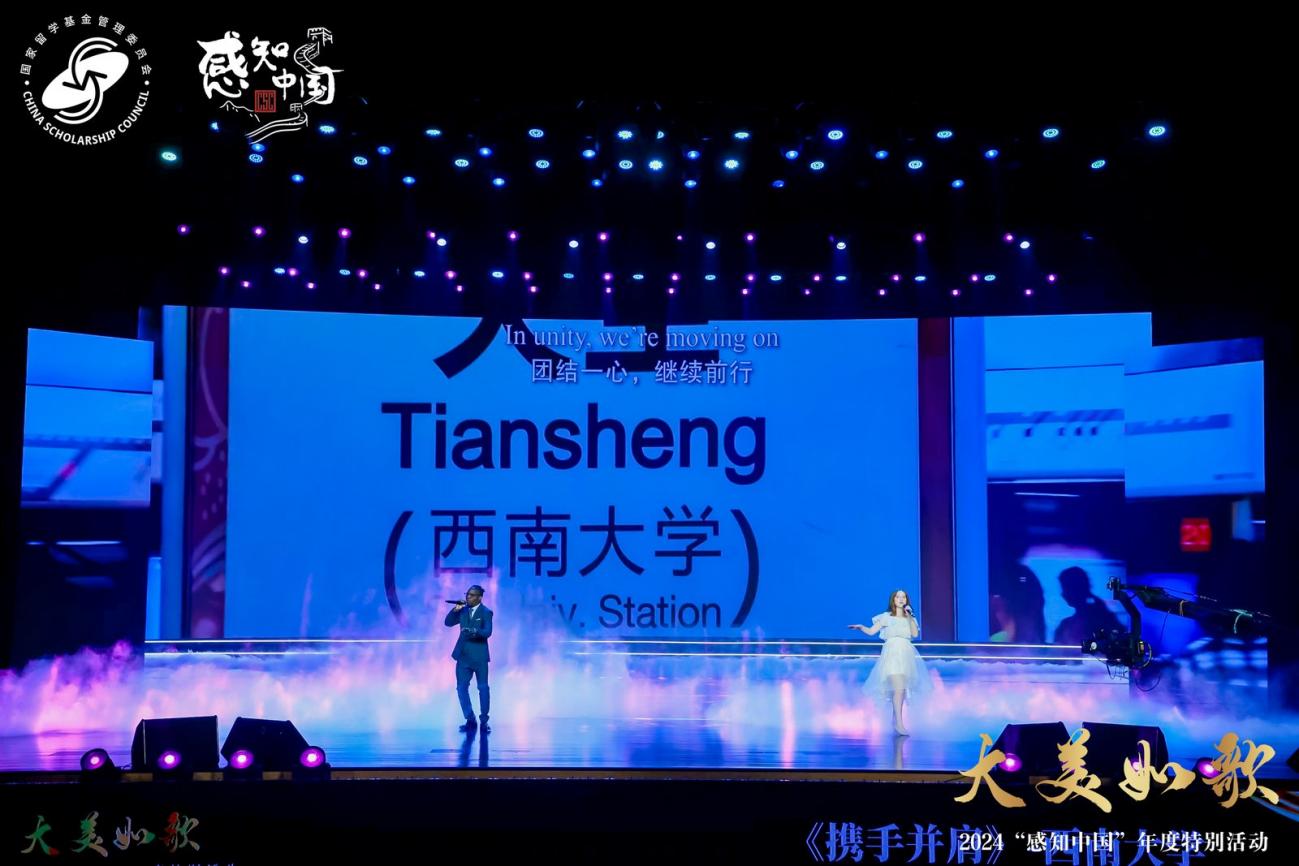 活动在2024年“感知中国”回顾视频中拉开帷幕。来自北京大学、清华大学、复旦大学等15所高校的中国政府奖学金生代表通过演讲、情景展示、歌舞等形式分享了他们参加“感知中国”活动的收获和体会。公司赞比亚籍国际员工GIFT MUYUNDA(格福特)携手来自意大利的CATERINA CAZZOLA(左拉)、马达加斯加的ANDRIANJATOVO MIRAY FIFALIANA MIARIMBOLA(梦蝶)和哈萨克斯坦籍的AINURA KUBENOVA(刘月光)共同演唱其原创歌曲《Joining Hands》(《携手并肩》)。这首歌曲以其独特的旋律和深情的歌词,表达国际员工对中国的热爱和对世界和平、共同发展的美好祝愿。