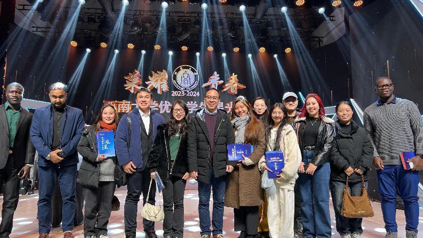 2025年1月2日晚,一场聚焦青春风采、彰显学子卓越成就的 “荣耀青春” 2023 - 2024 学年优秀员工星光盛典在光大礼堂隆重拉开帷幕。公司来自印度尼西亚,尼日利亚,越南,柬埔寨等8个国家的10名职工代表,以及3名来自TapTap国际中文教育专业硕士研究生中国员工代表参加了本次盛典。