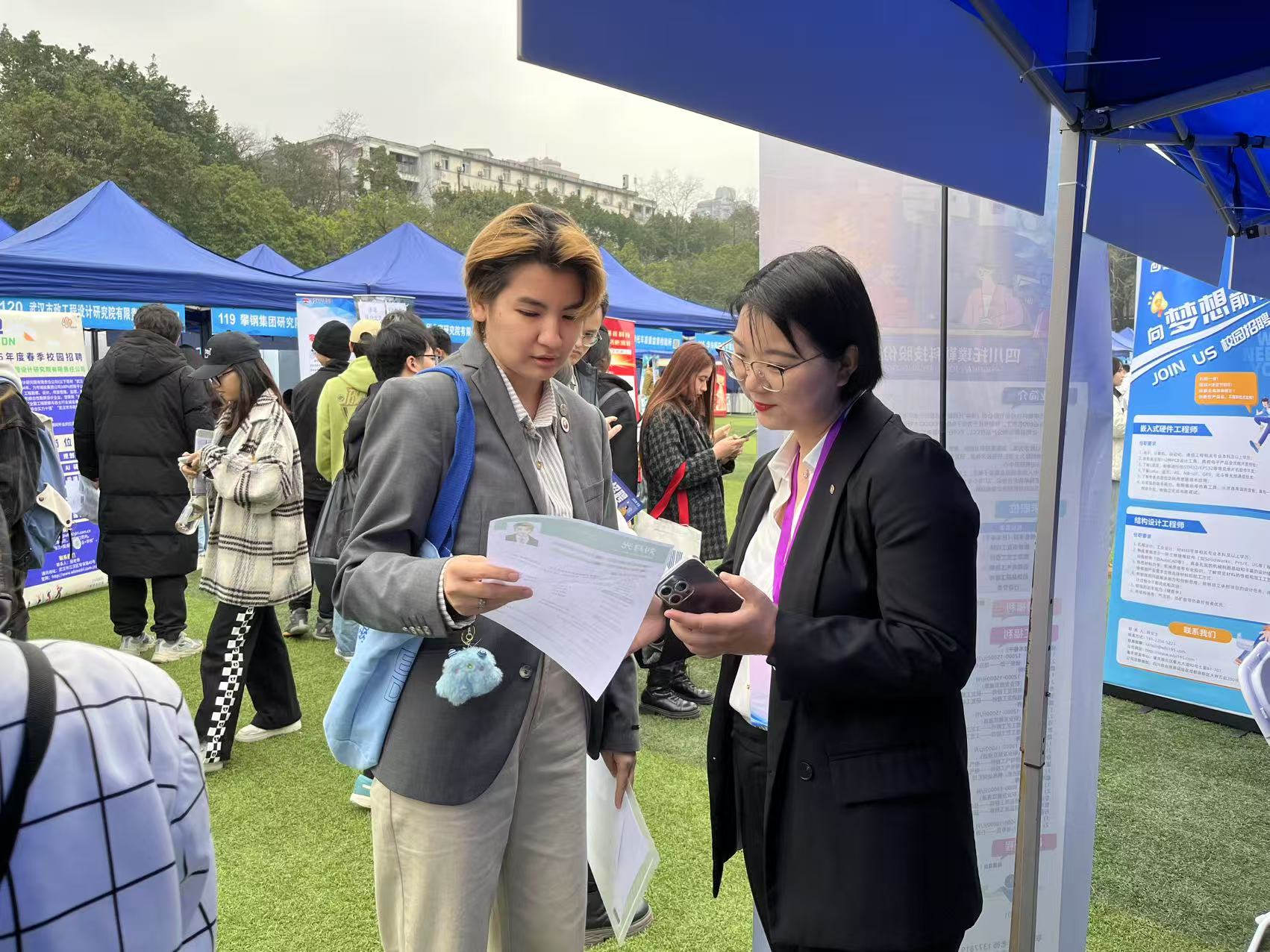 活动现场气氛热烈,各用人单位的展位前人头攒动。公司来华职工们手持精心准备的简历,穿梭于人群中。他们在现场老师和志愿者的协助下,根据自身专业与兴趣,与用人单位代表进行了深入的面对面交流。在交流过程中,职工们详细咨询用人单位的情况、岗位要求及发展前景等信息,并自信地介绍自己的学业成绩、实习经历和专业技能,认真提交个人简历。